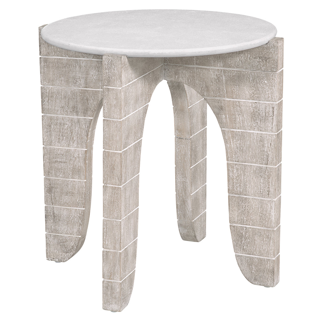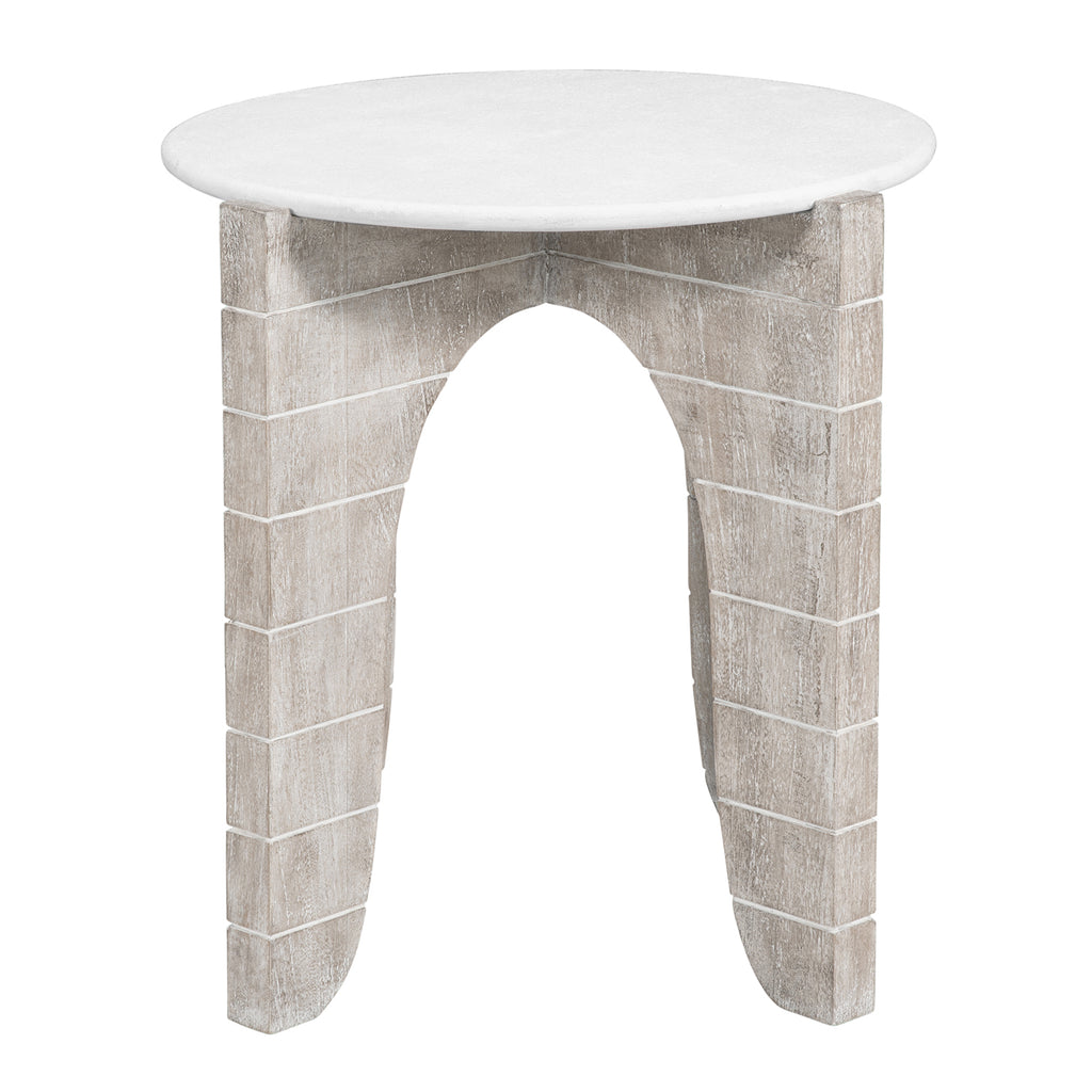The Bali End Table, where coastal modern farmhouse design meets thoughtful craftsmanship. Crafted with a solid mango base in a white-wash finish, adorned with horizontal grooving for a planked effect, and topped with a textured resin in a faux plaster finish, this table is a true work of art