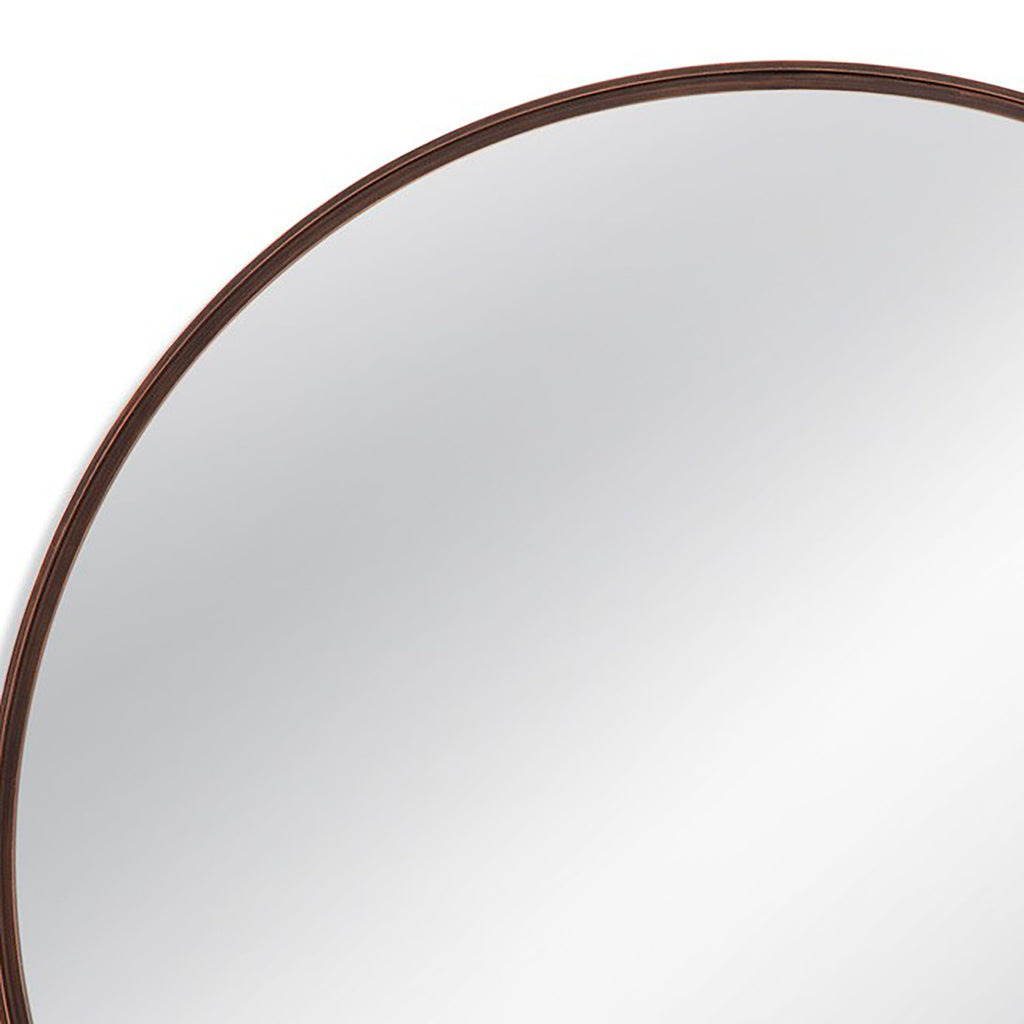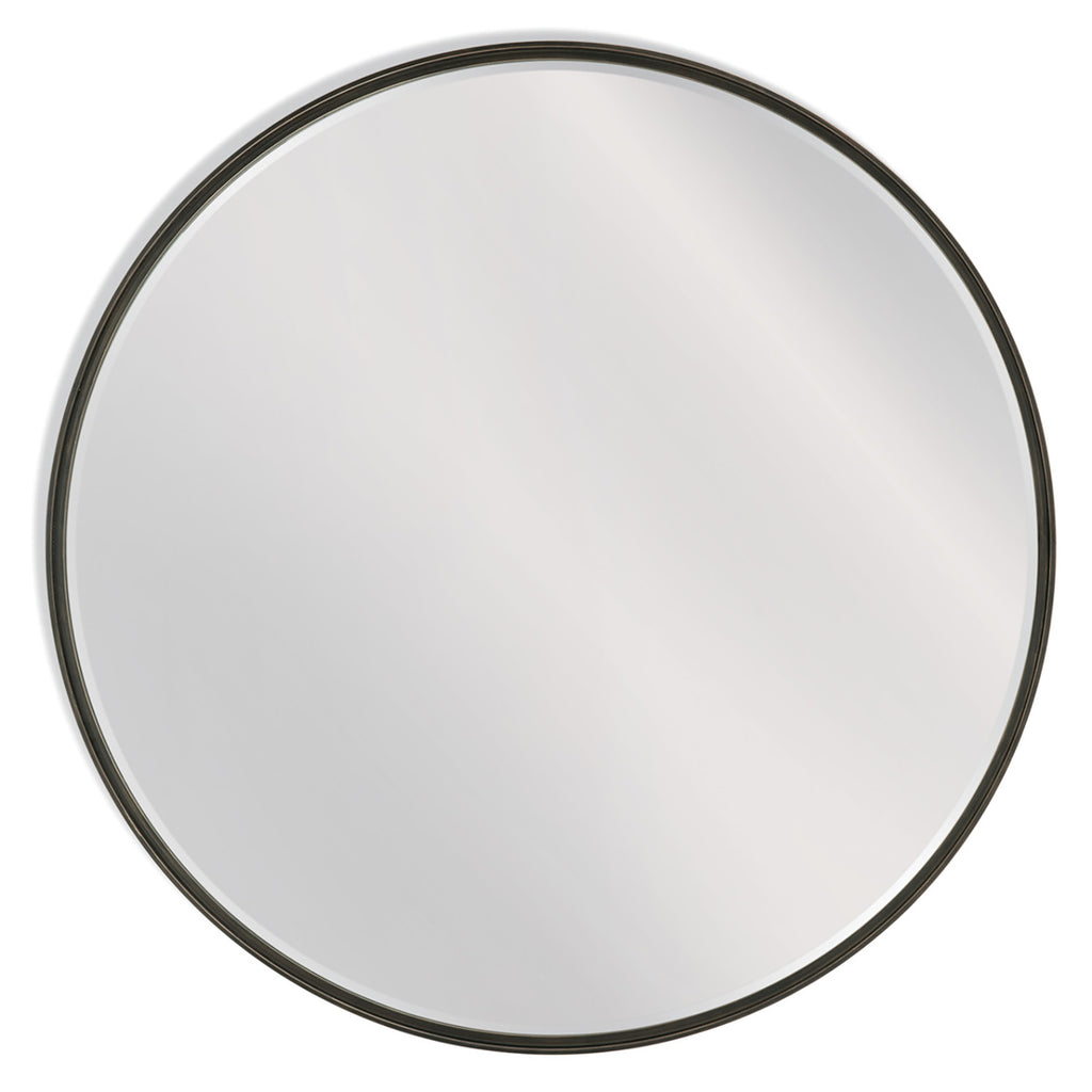 The Bedford Wall Mirror presents a round design with a modern industrial profile, boasting a black metal-like finish accentuated by a gold brushing overlay. Its sleek, thin frame complements modern minimalist styles effortlessly. With its unique finish blending black metal and gold brushing, this large 48 inch round mirror makes a statement in any room.