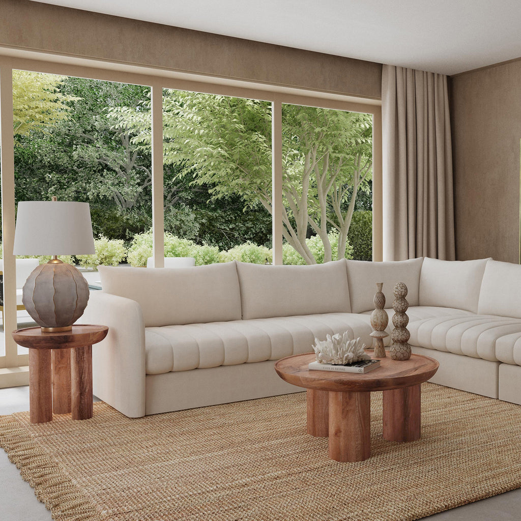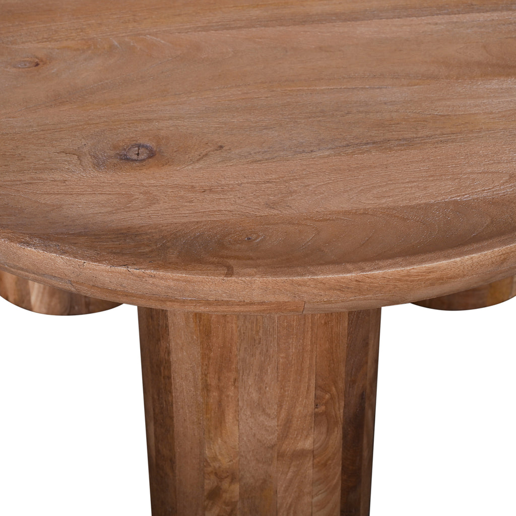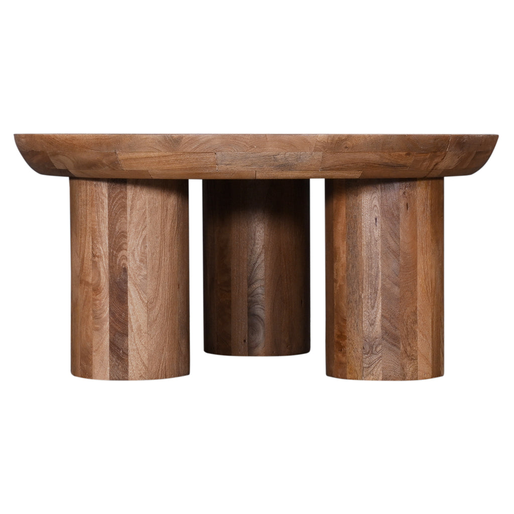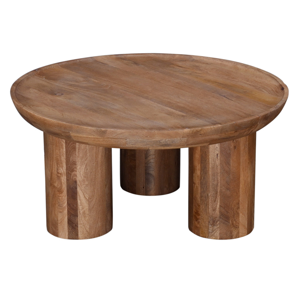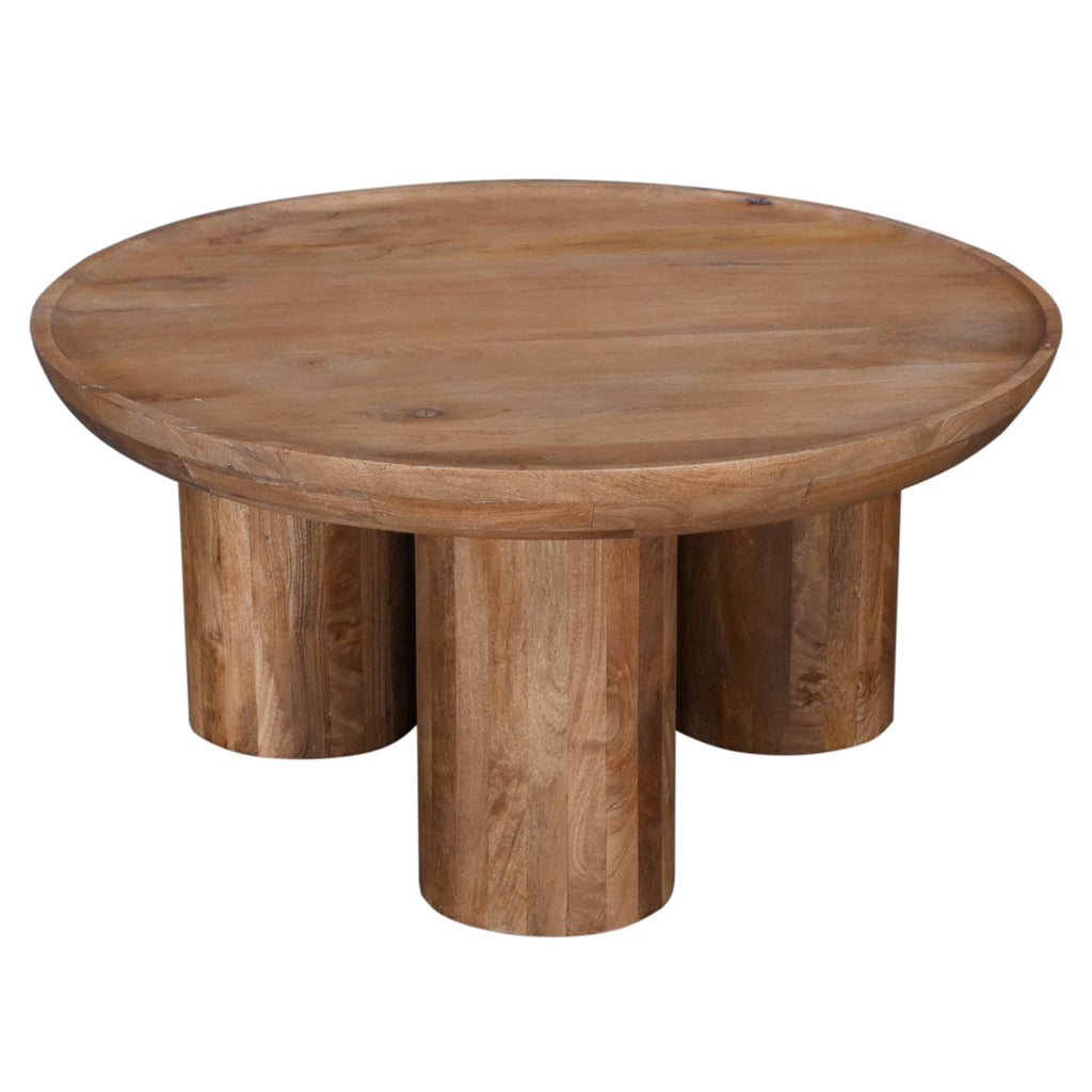 The Blair Cocktail Table captures the essence of modern Boho design, offering a charming addition to your home. With its distinctive drum-style silhouette, oversized round three-legged base, and a scooped concave top, this table is a true statement piece. Crafted from sandblasted mango wood in a soft antiqued finish, it beautifully accentuates the natural wood's features.