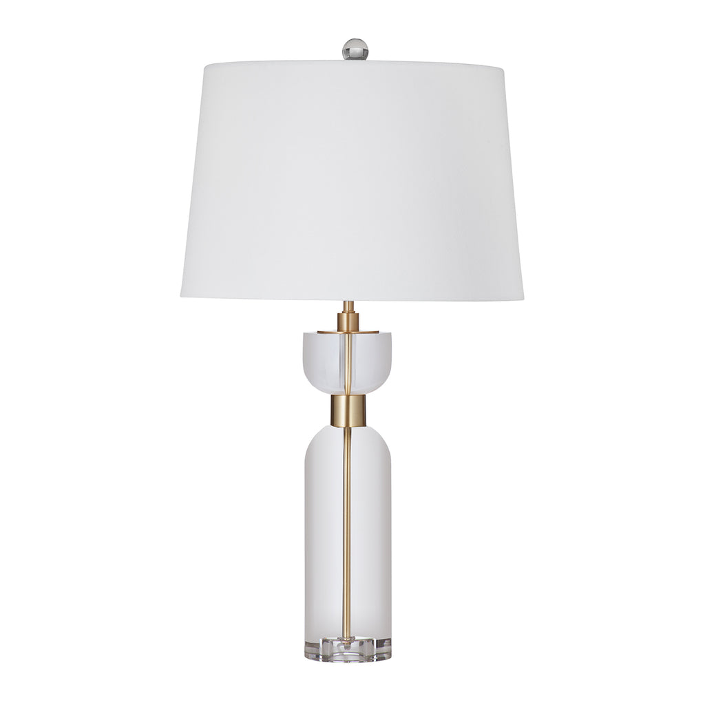 The Bollin Table Lamp combines a crystal and brass base, offering a perfect balance of modern elegance and refined style. The sleek design adds sophistication to any room, while the white tapered drum shade softens the light, creating a warm, inviting atmosphere. This lamp's timeless appeal fits seamlessly into a variety of interiors, enhancing your space with both function and beauty. The Bollin Table Lamp is a versatile piece that brings contemporary charm to your home decor.