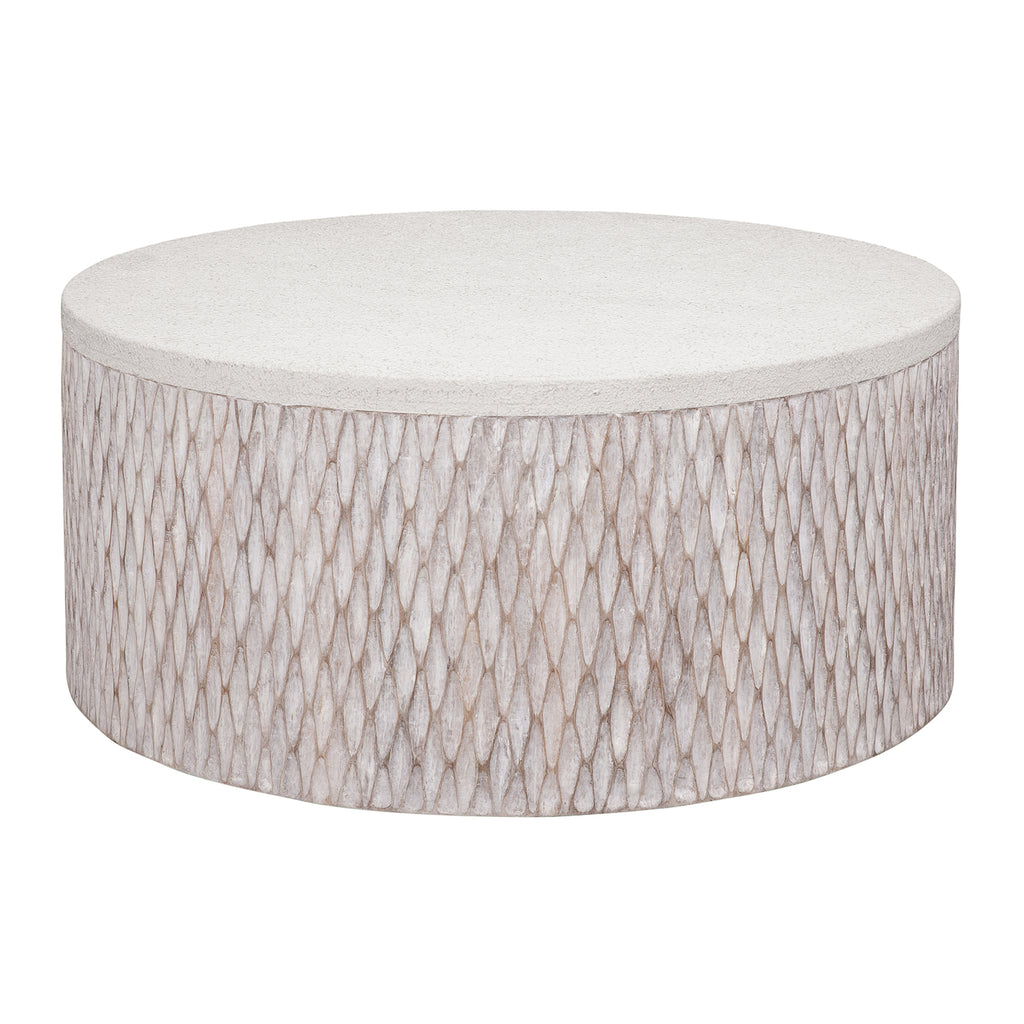 The Brewer Accent Cocktail Table blends coastal and farmhouse with thoughtful design. Crafted with a carved solid mango base in a white-wash finish and topped with textured resin in a plaster finish, this table adds character to any space. With convenient casters for mobility, Brewer offers a blend of style and functionality.