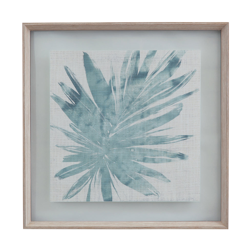 Burlap Ocean Palm III is a straight cut print floating in clear glass surrounded by a 7/8in weathered washed frame.
