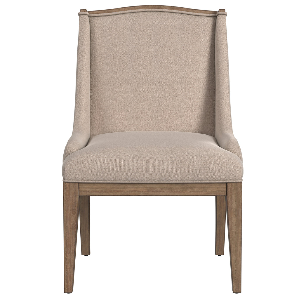 The Buxton parsons chair features wrap around arm styling in an oatmeal color textured fabric with wooden legs and accents in a weathered natural finish.