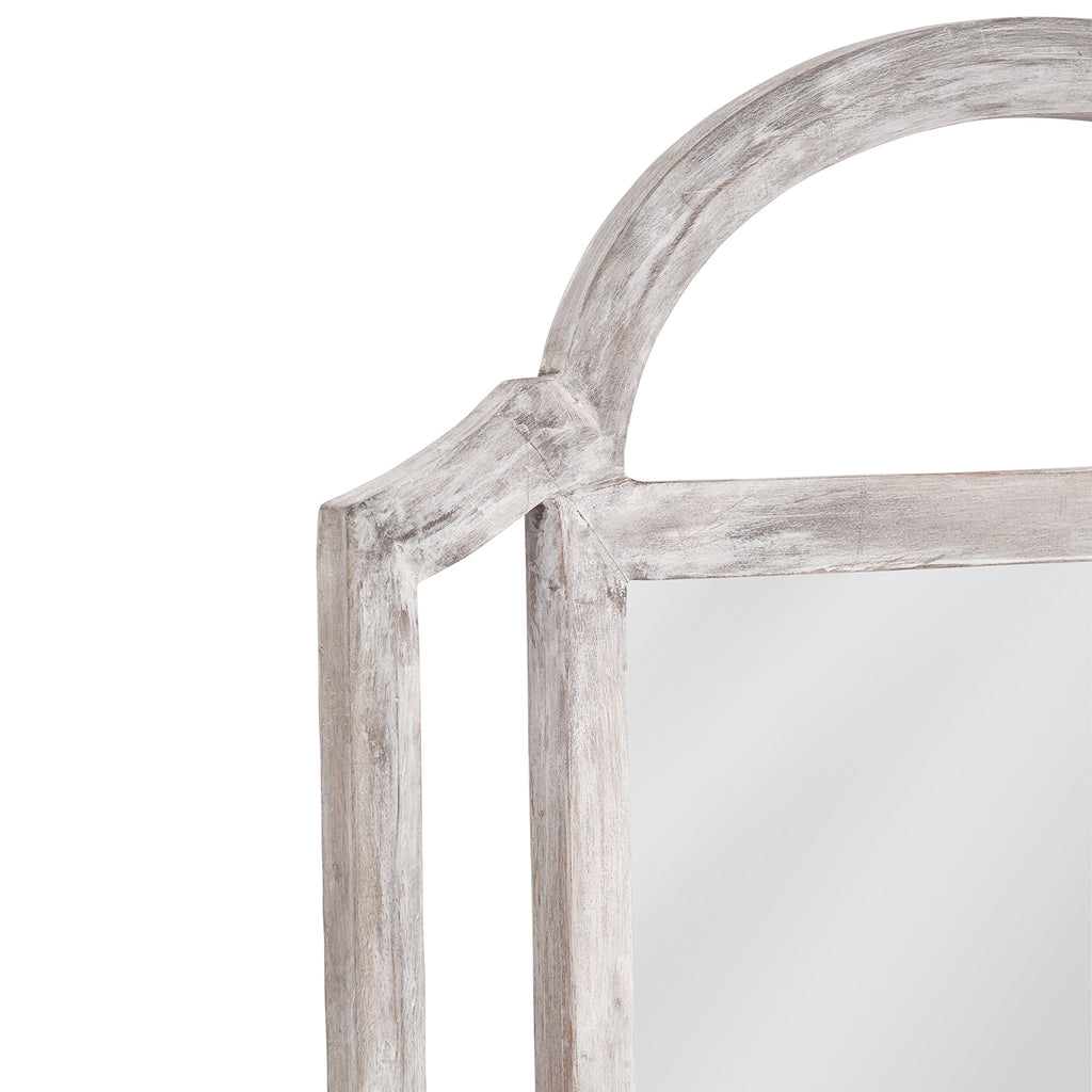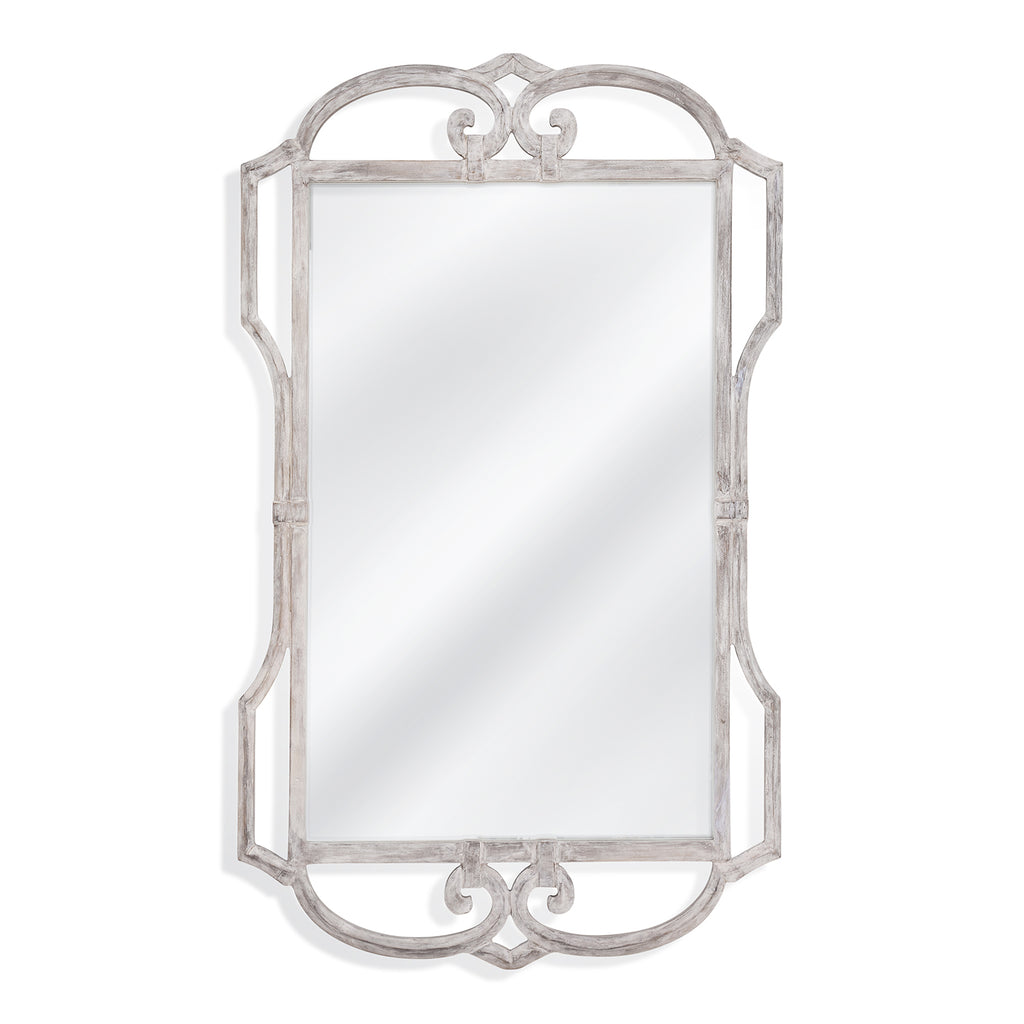 The Carthage Wall Mirror is rectangular with a cutout frame in a weathered white finish.