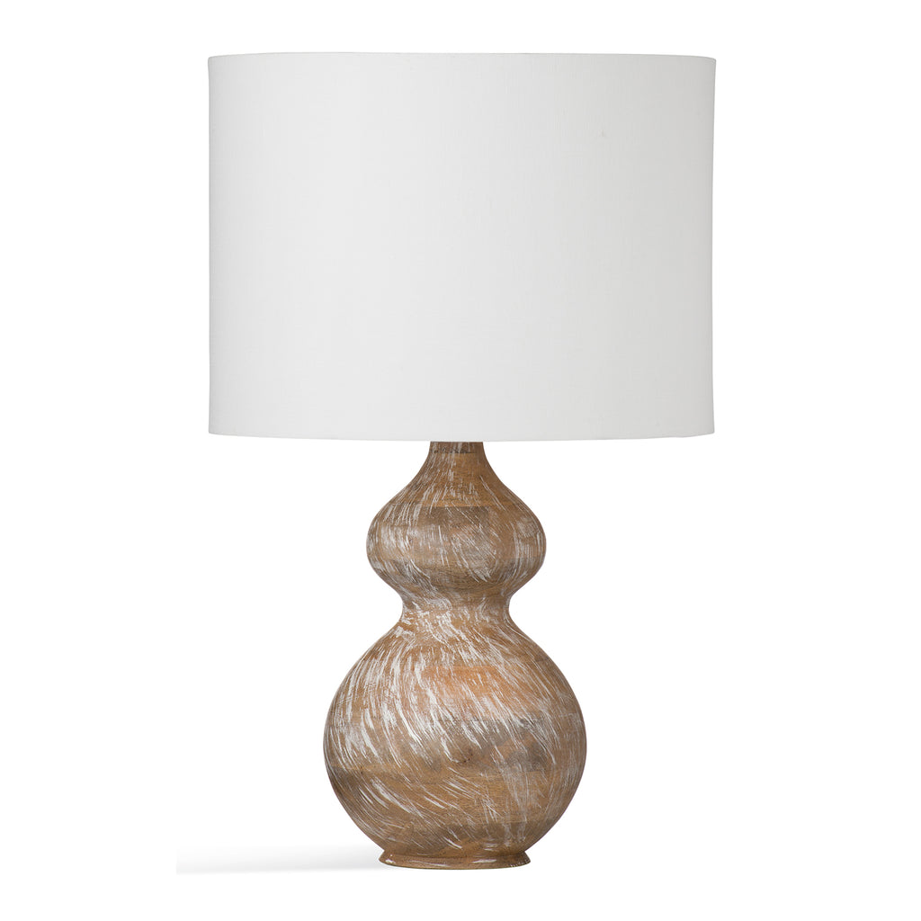 Caveette Table Lamp is crafted of mango wood with a gourd like shaped body. The natural wood finish features white washed distressing. The lamp is completed with a white cotton drum shade.