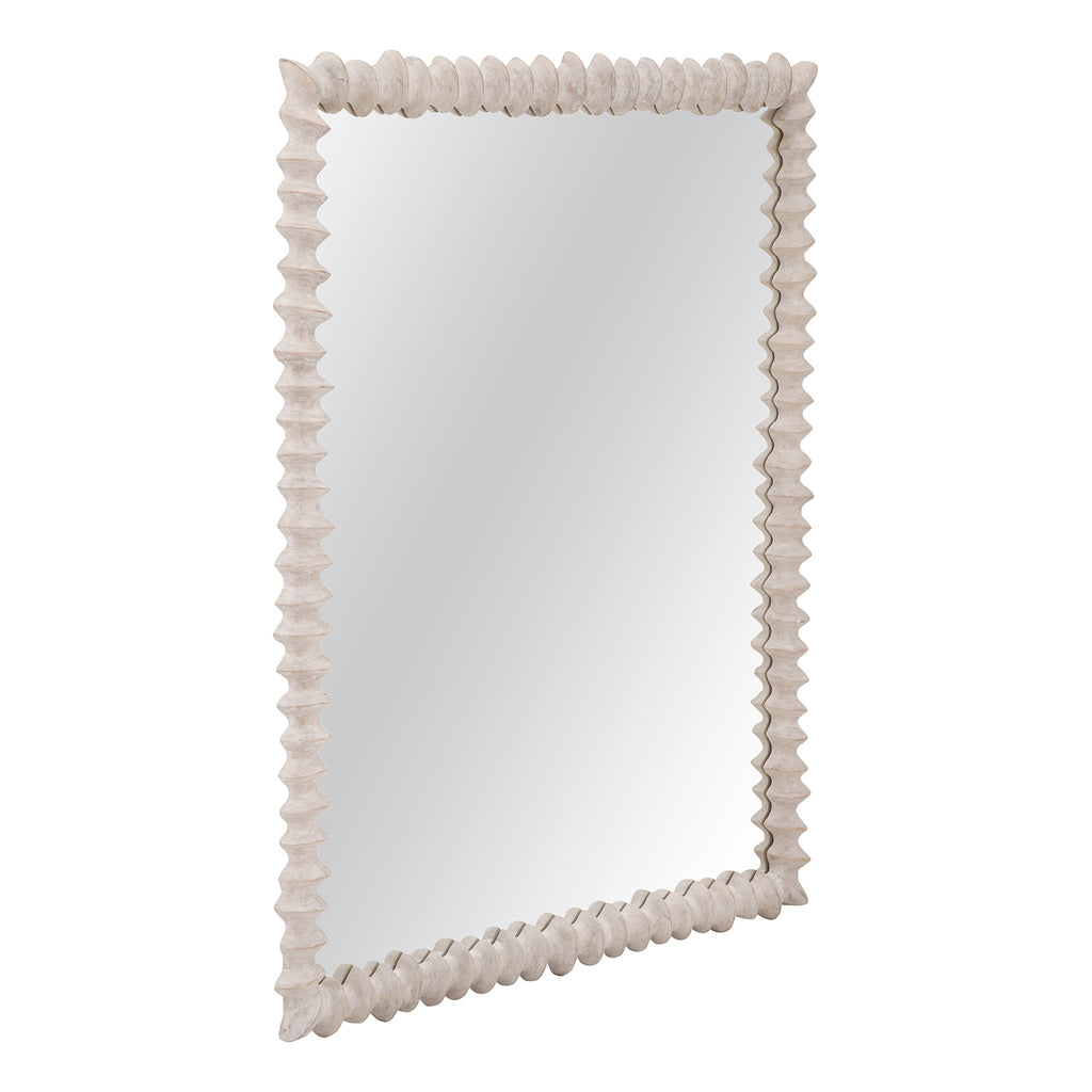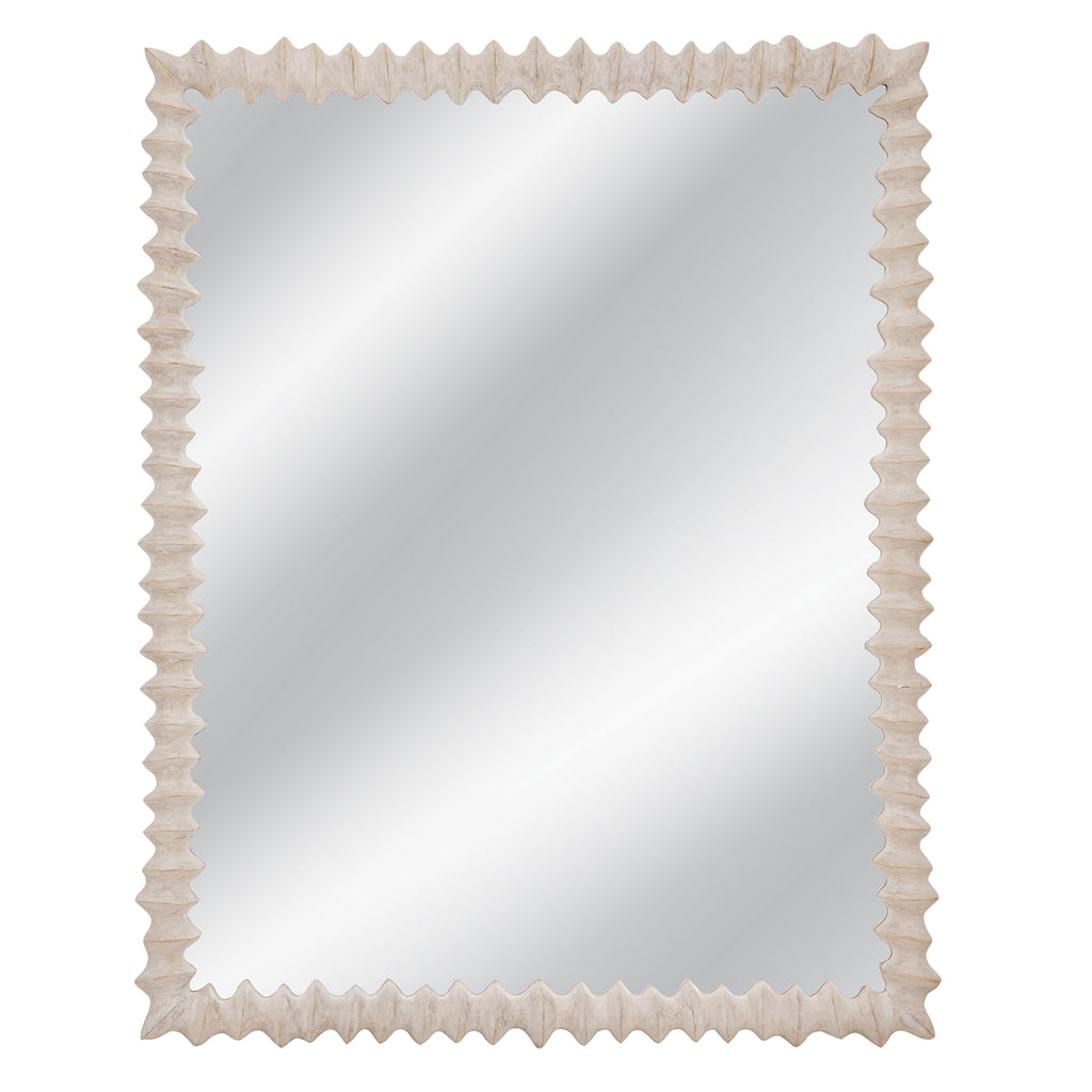 The Churchill Wall Mirror blends modern appeal with artisan craftsmanship. Its rectangular shape is framed by uniquely carved wood in a distressed white wash finish, offering a fresh yet timeless look that elevates any interior.