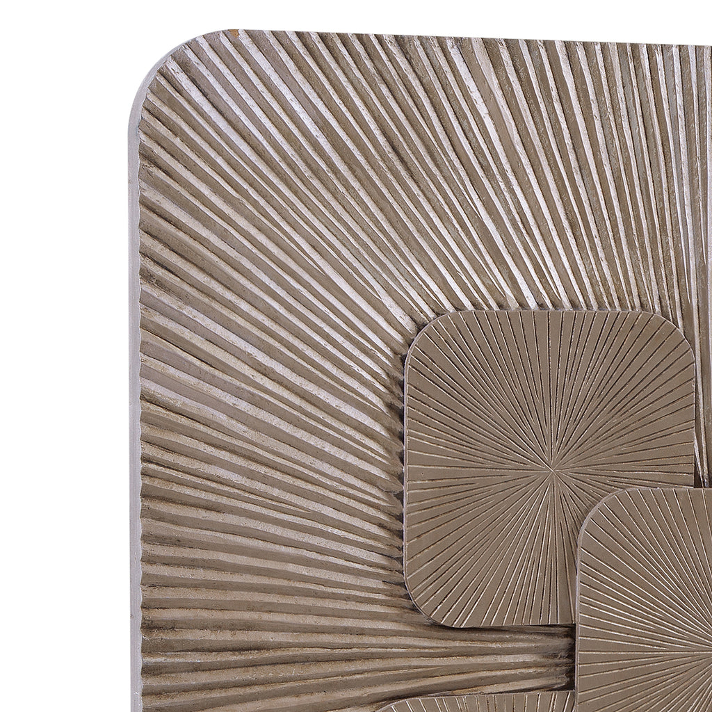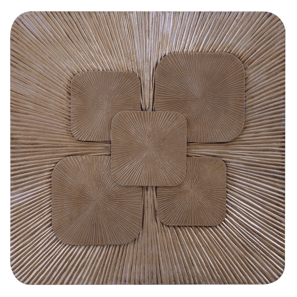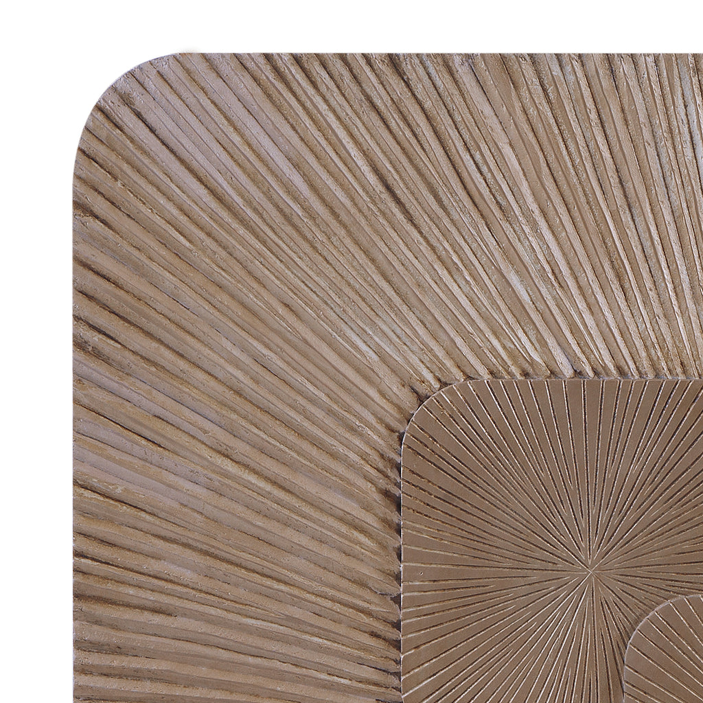 The Crobuzon Wall Art features a rustic modern carved wood panel with a starburst pattern background, where wood pieces mimic the natural form of organic leaves. The design blends earthy elements with a contemporary touch, creating a unique and striking focal point for any space. The rounded corner detail adds a soft, refined touch, enhancing the overall aesthetic. This piece brings a sense of warmth and nature into your home while maintaining a stylish, modern appeal.