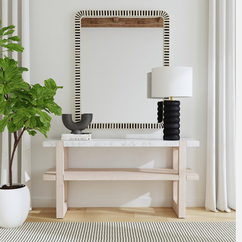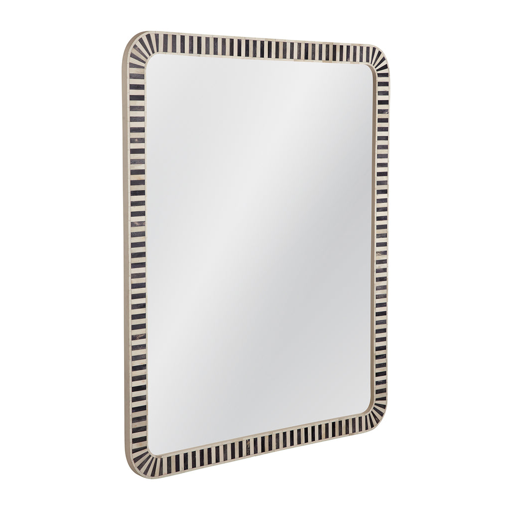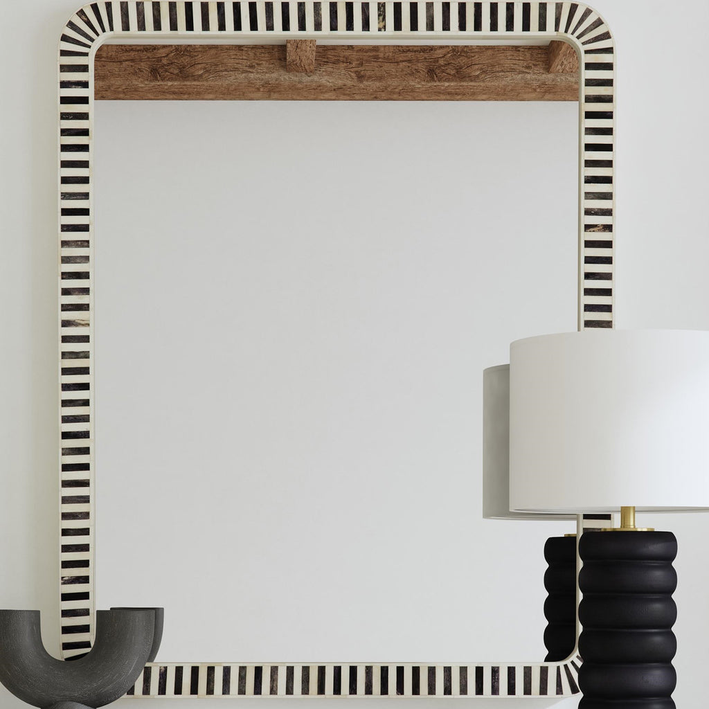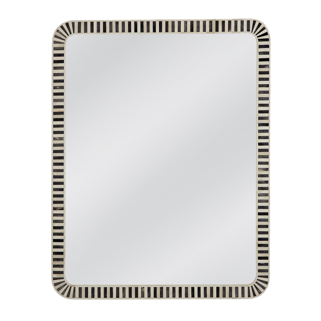 The Cyrus Wall Mirror presents a sleek and modern design, featuring a rectangular shape with rounded corners. Its chic black frame paired with cream and gray bone accents exudes contemporary elegance, making it a sophisticated addition to any living space. Crafted with attention to detail, this mirror effortlessly enhances your home decor with its minimalist yet stylish appeal.