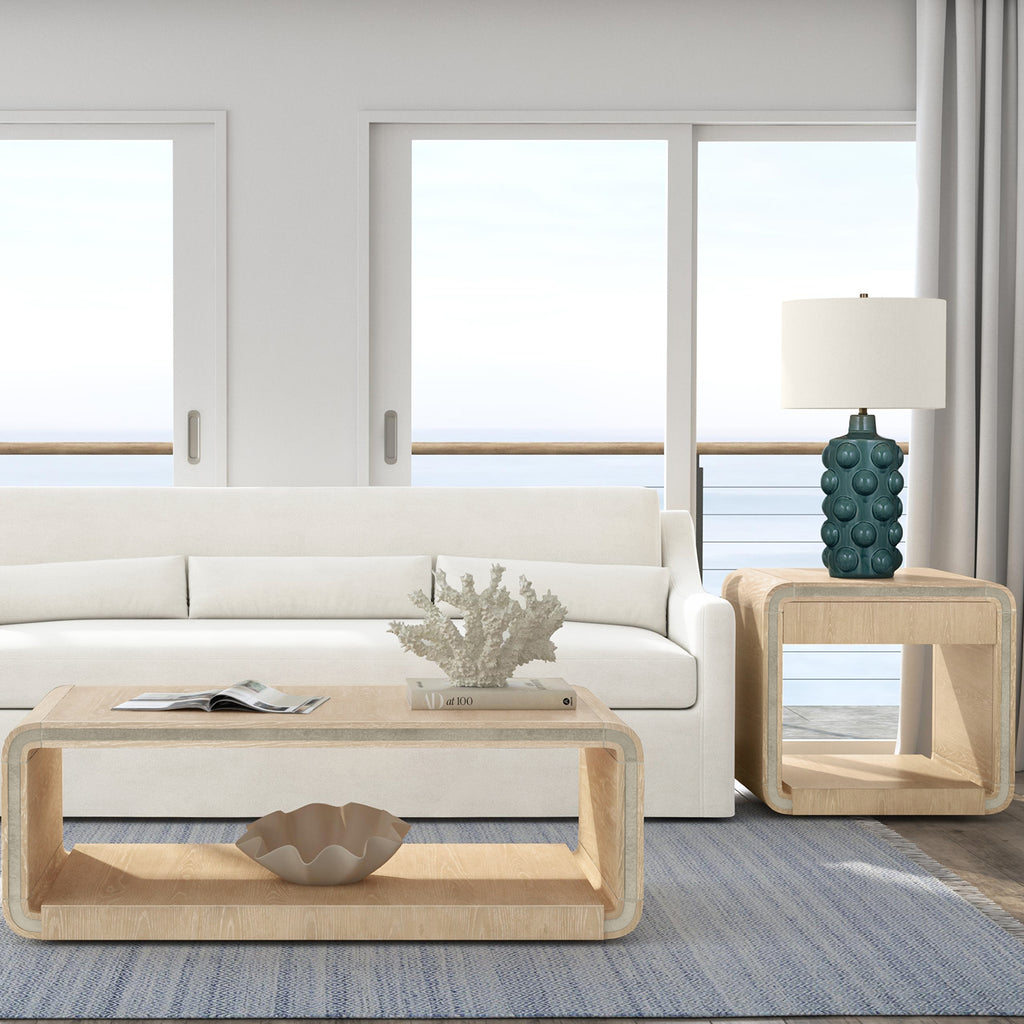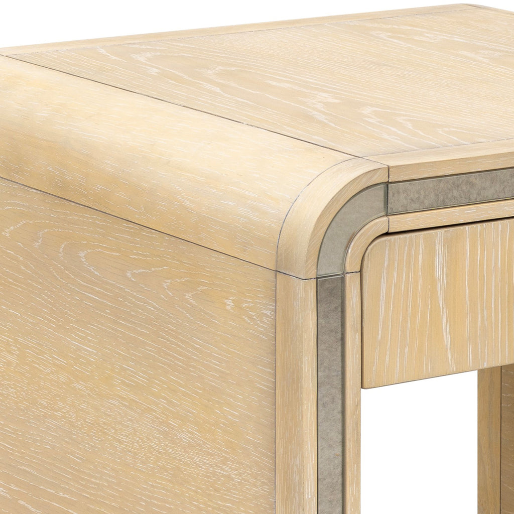 The Damone End Table features a refined, modern silhouette crafted from white oak veneers in a casual blonde oak finish. Accented with elegant antique mirrored detailing, it adds a sophisticated touch to any living space. The design includes a single drawer with full-extension side mount glides, providing convenient storage for essentials. With its versatile style, this end table complements a range of decor, making it a perfect addition to both casual and formal settings.