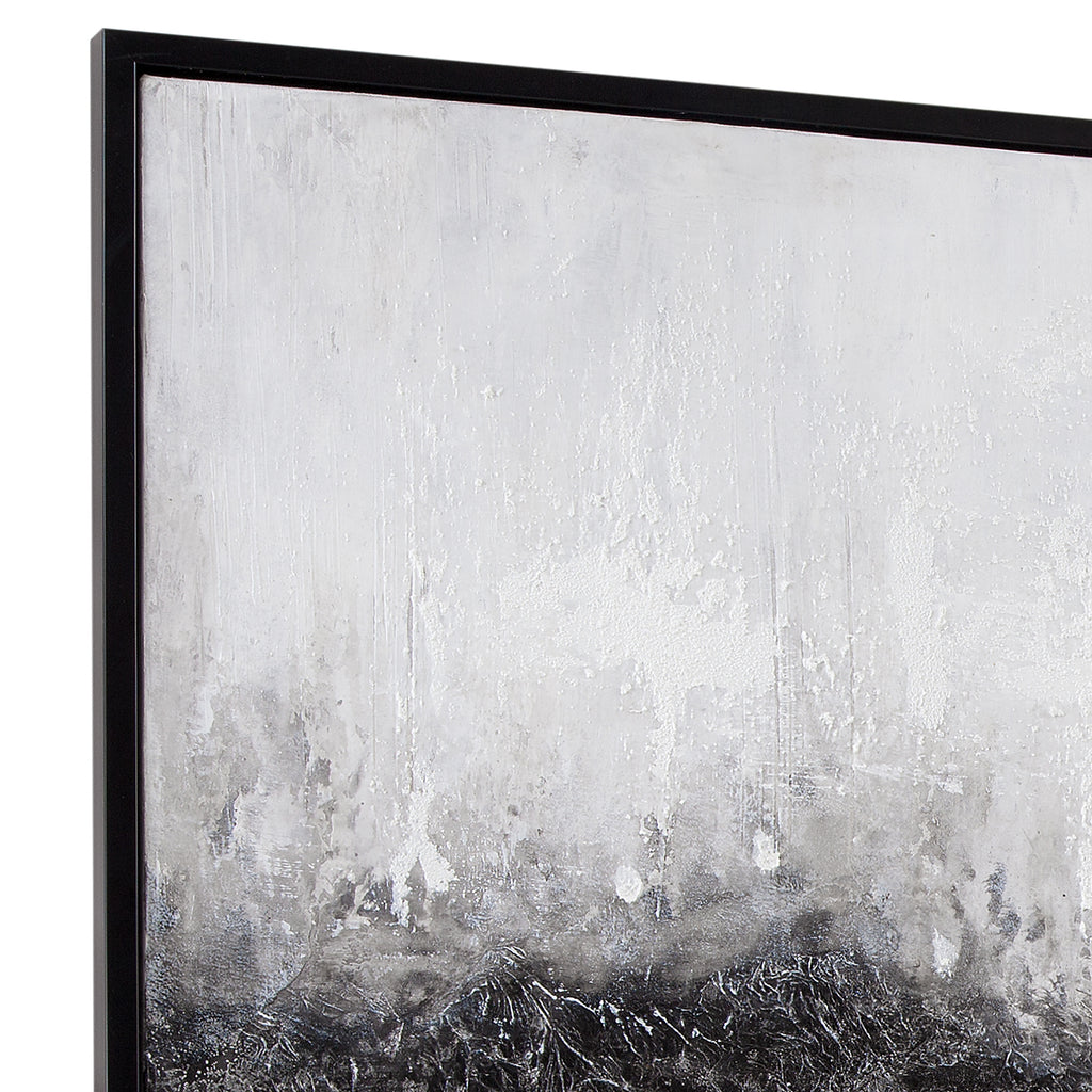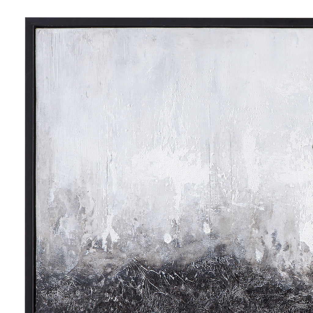 The Dividid Framed Canvas features a contemporary black and white abstract design in cool tones, creating a striking visual impact. The bold contrast of black and white adds depth and interest, making it an eye-catching piece that complements modern interiors. Framed in sleek black, this canvas art adds a touch of sophistication and edge, enhancing any space with its artistic flair.
