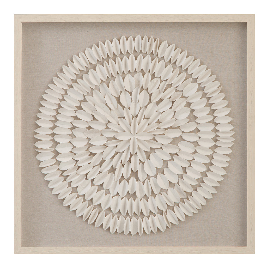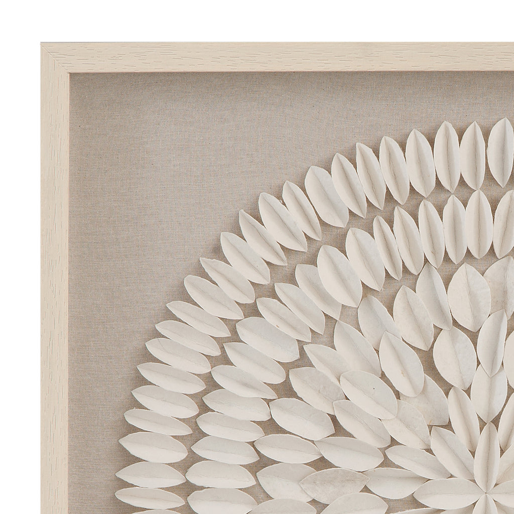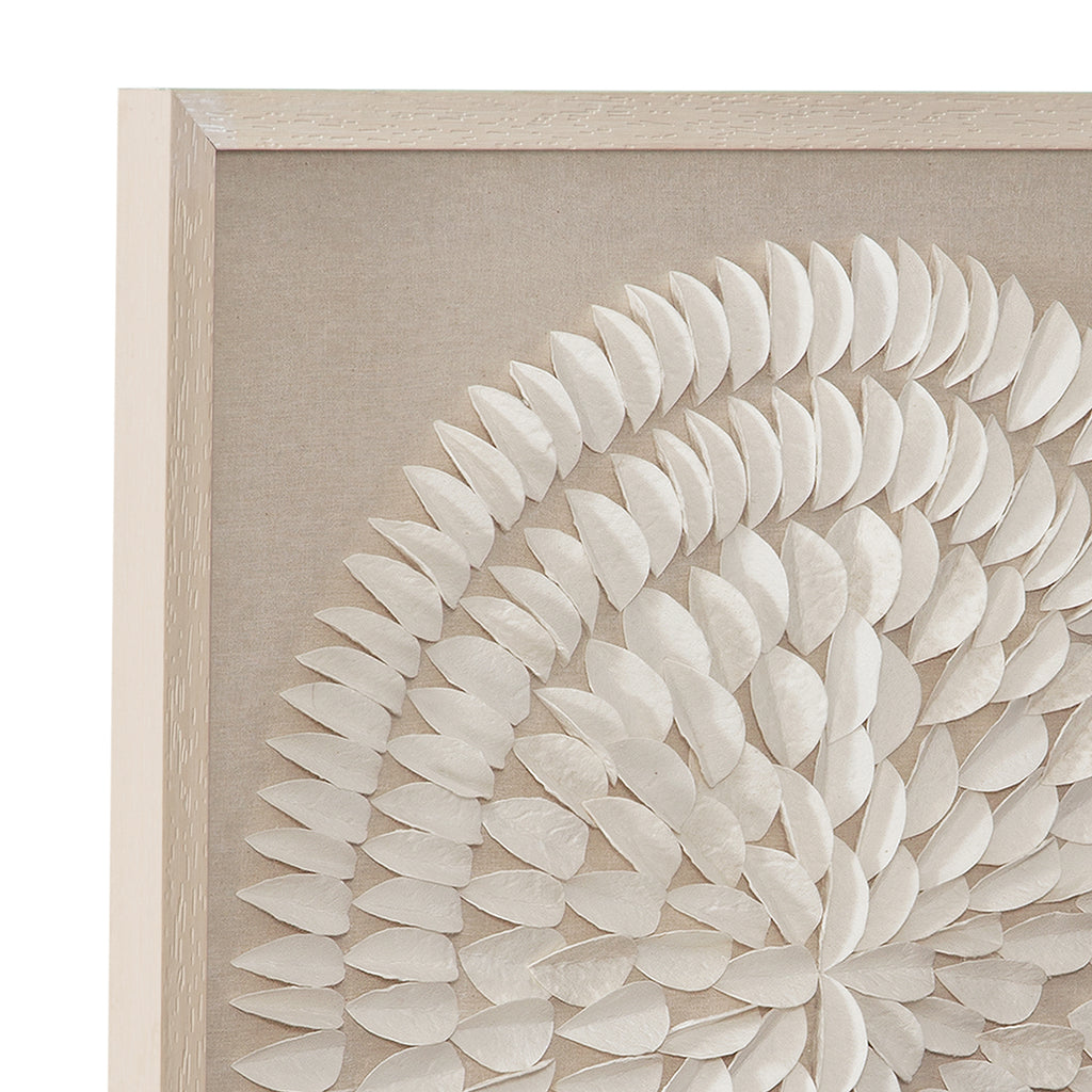 The Donellie Wall Art showcases a neutral organic style, featuring folded rice paper pieces arranged to create a bold round medallion design. The soft linen background adds texture and depth, while the off-white frame complements the piece with a subtle, refined finish. This unique artwork brings an elegant yet natural touch to any space, offering a balance of simplicity and artistry that enhances a variety of interior styles.