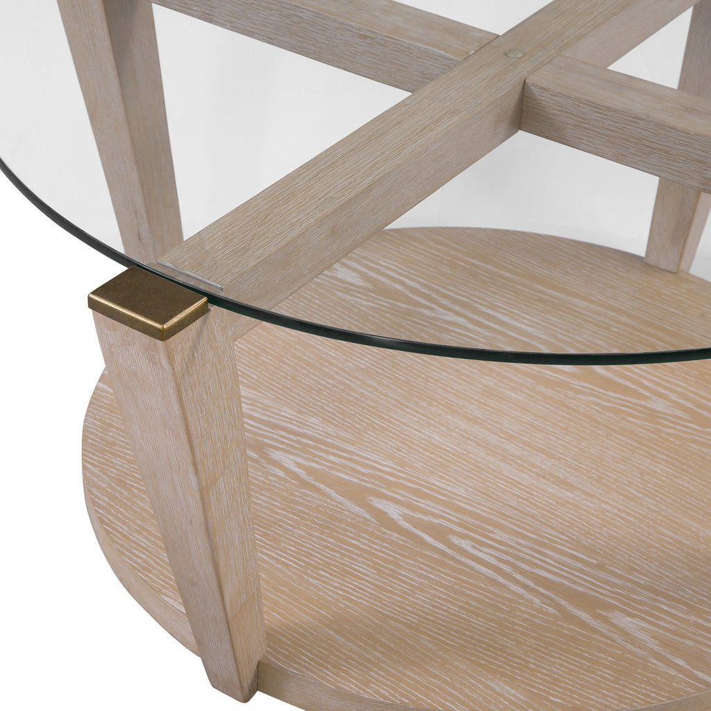 The Dunes Cocktail Table effortlessly merges coastal charm with modern sophistication, making it a captivating focal point in any living space. Crafted with meticulous attention to detail, its clean lines and wire-brushed wood frame finished in bleached oak evoke a sense of seaside tranquility. The lay-on glass tops, nestled within the frame and adorned with antique brass-finished post caps, add a touch of elegance to its design. With a convenient bottom shelf for extra storage and concealed casters for easy mobility, this table seamlessly combines style with functionality. Each piece undergoes a manual wire-brushing process, resulting in unique textural variations that enhance its natural beauty.