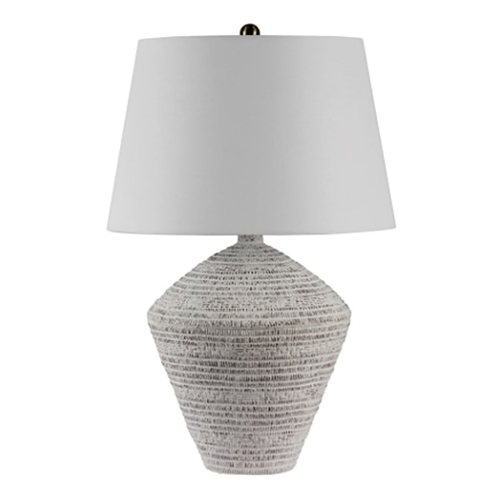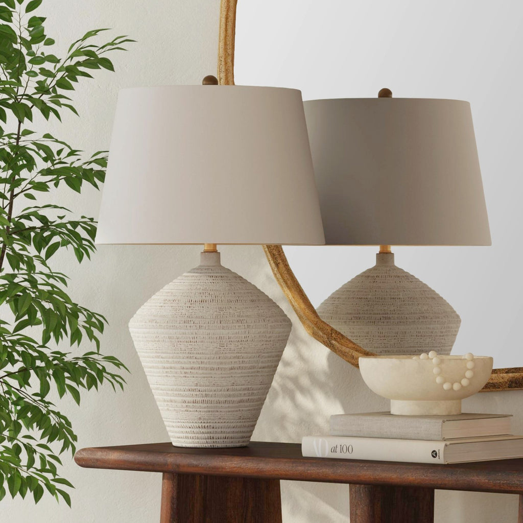 The Eclipse Table Lamp features a concrete body with a tactile, textured surface that provides a visual interest reminiscent of natural stone or woven fabric. Its base tapers to a narrower neck before expanding into a wider form, creating an eye-catching geometric silhouette. This lamp is completed with a classic white lampshade, ensuring that the lamp casts a warm, diffused light, ideal for creating a cozy and inviting atmosphere. The neutral color palette and intricate texture make the Eclipse Lamp versatile for both contemporary and more traditional interiors.