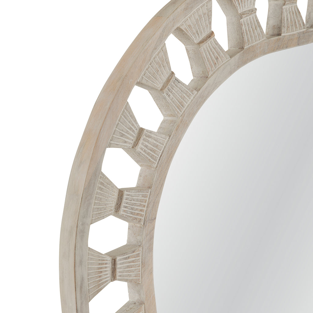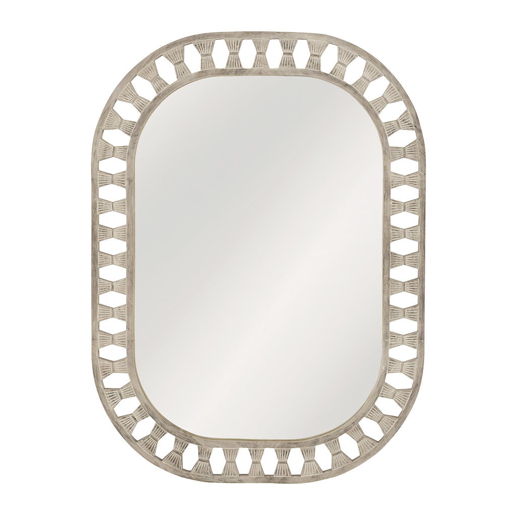 The Enya Wall Mirror offers a modern coastal vibe with its white wash finish and charming cutout patterned frame. Its rectangular shape with rounded corners adds a contemporary touch to any space. A stylish addition that effortlessly complements coastal-inspired decor.