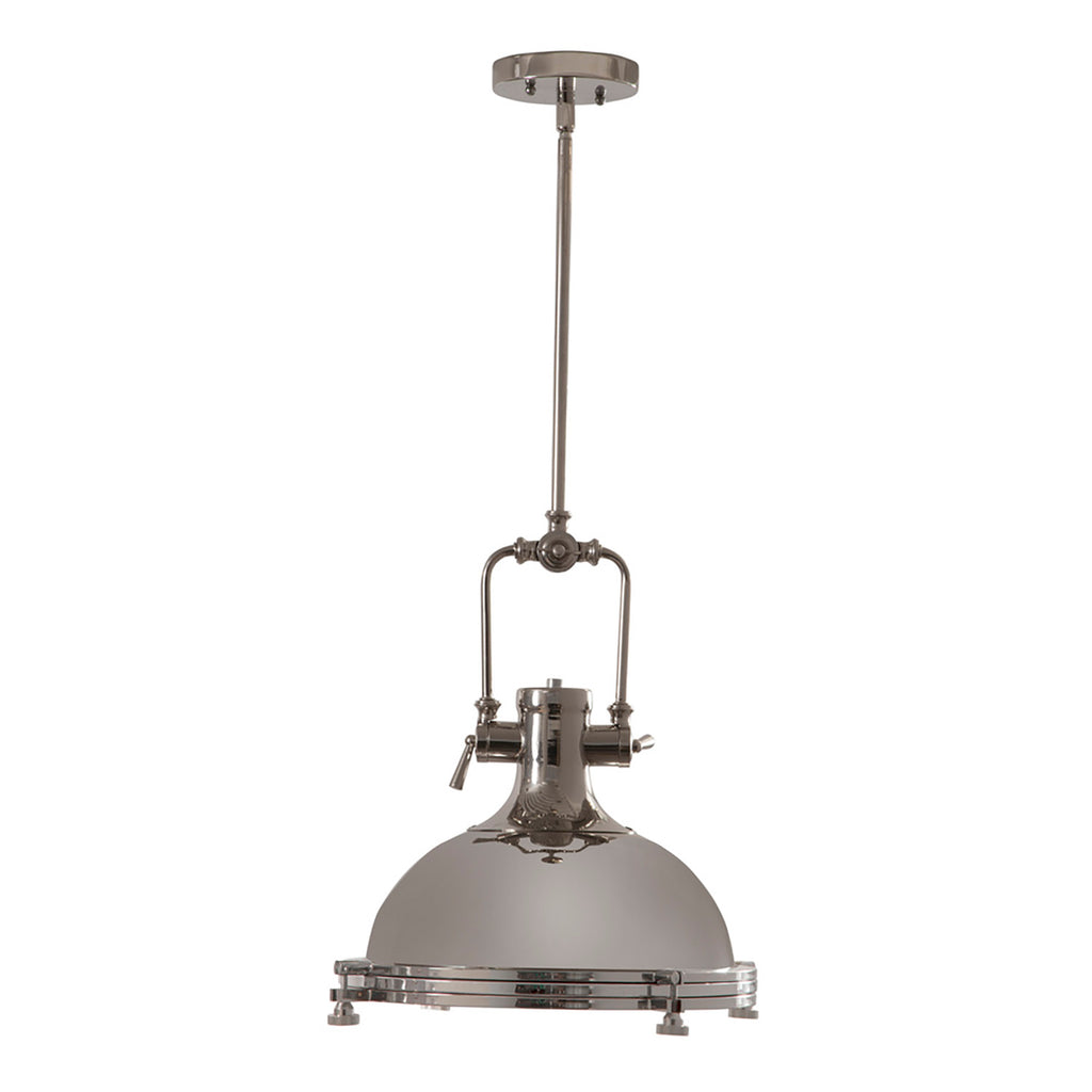 The Fennell pendant in chrome has an industrial yet modern appearance with a portholesque glass window.