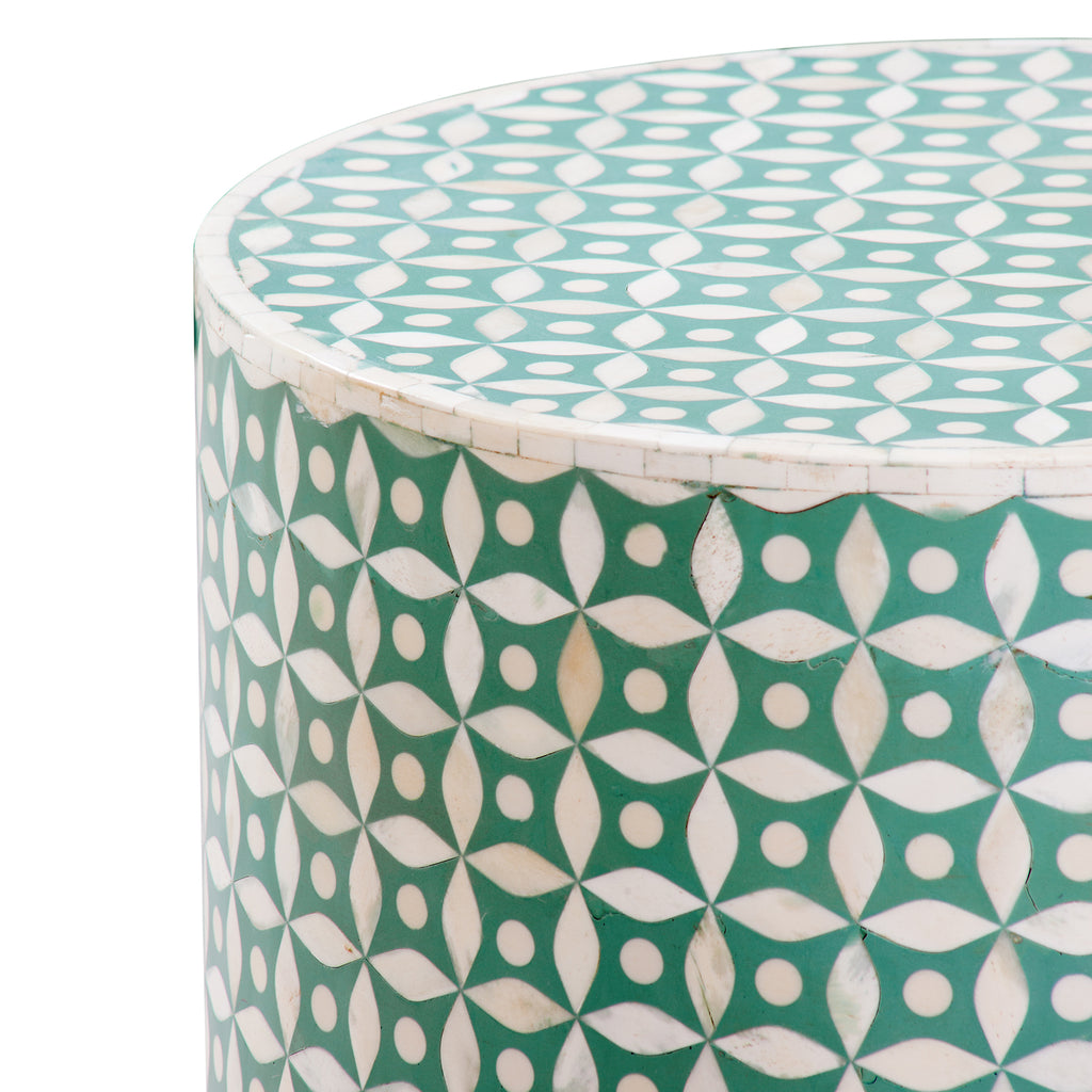 Finch Scatter Table is a round scatter table with a diamond patterning alternating natural bone and seafoam resin