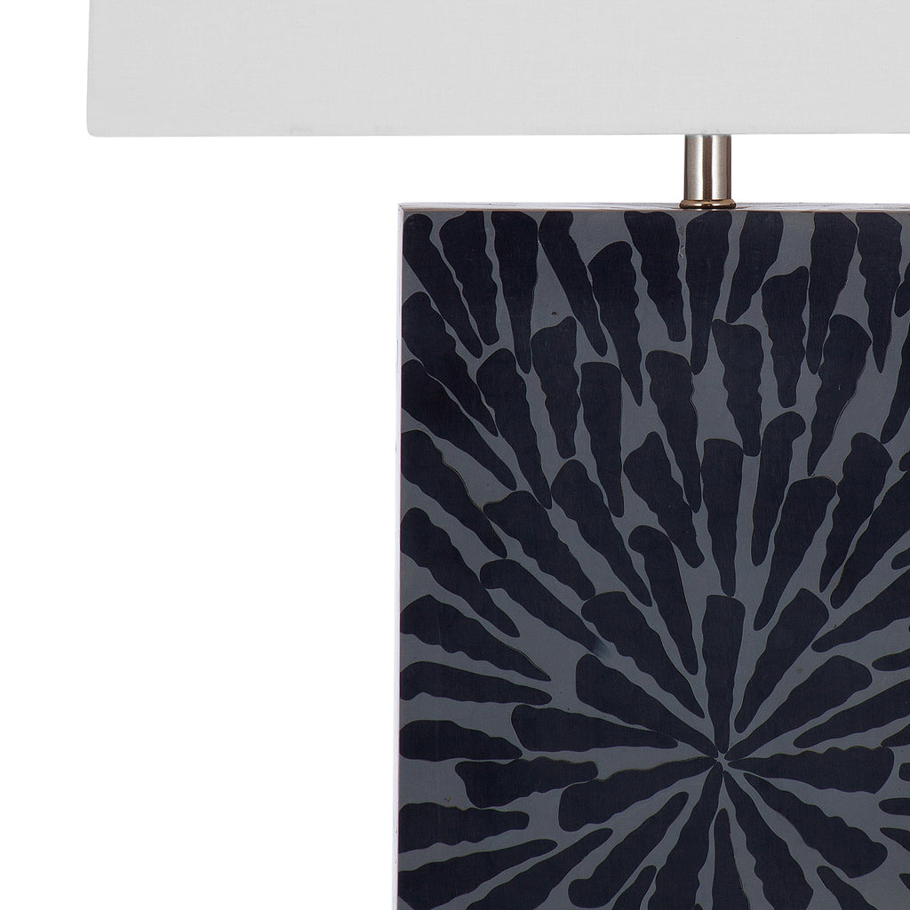 The Fleur Table Lamp is crafted of bone with a white rectangular shade.