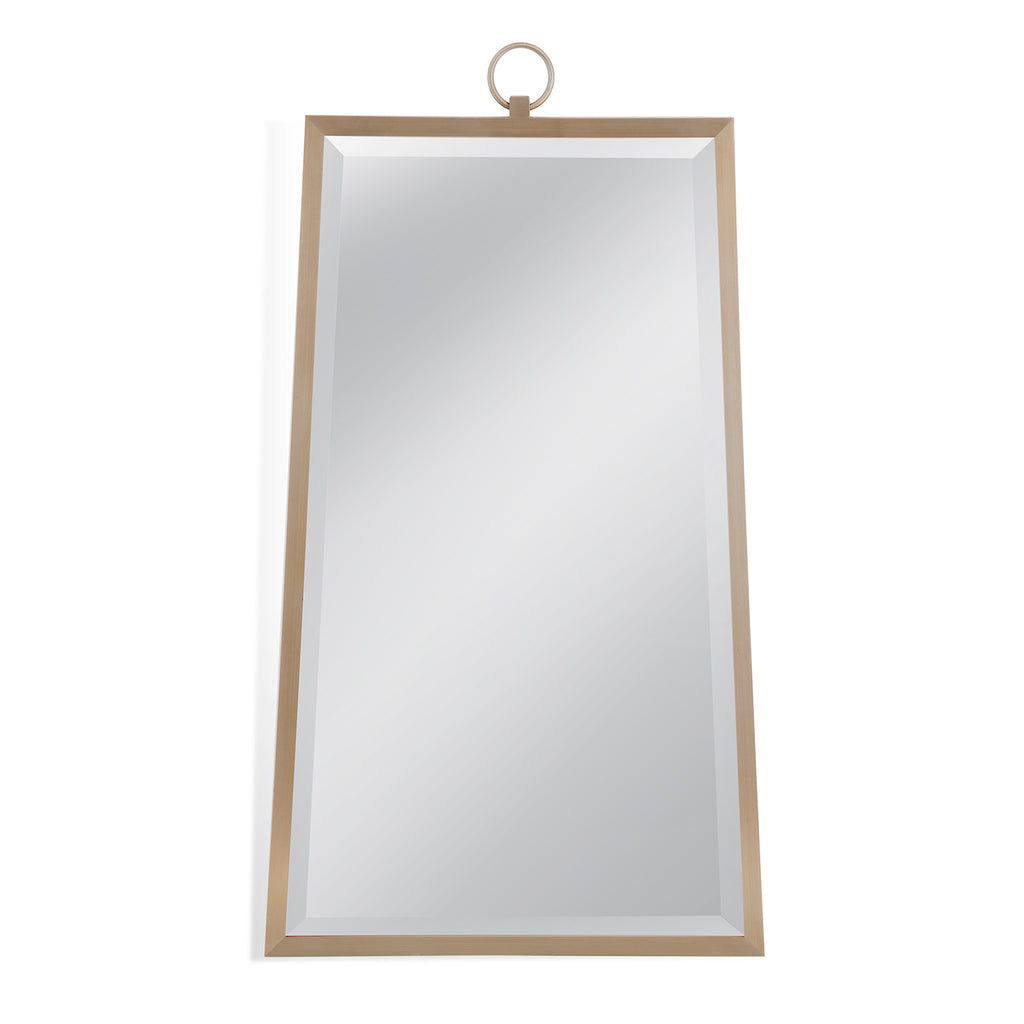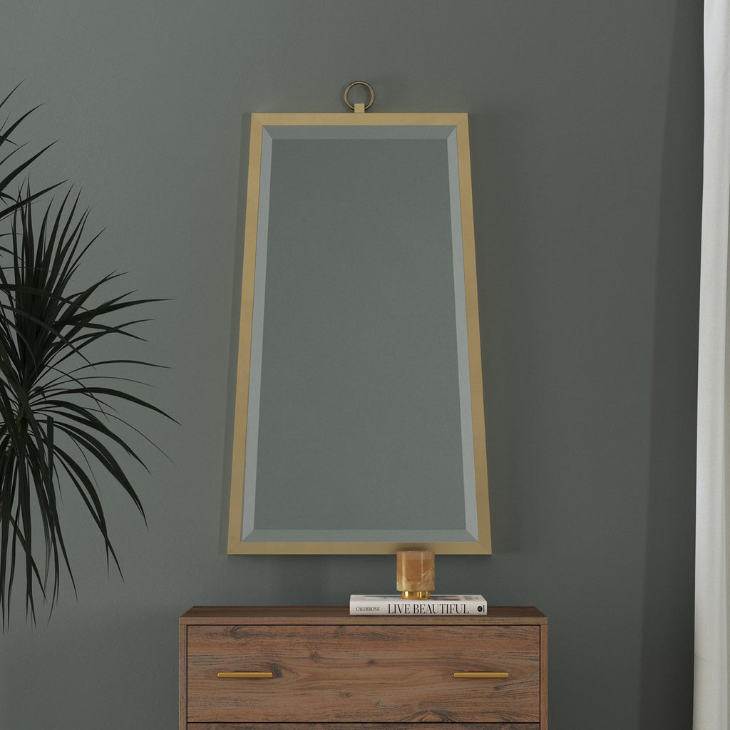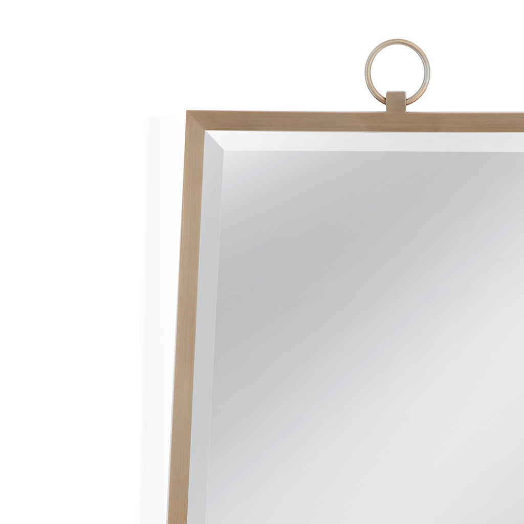 The Floris Wall Mirror is a rectangular shaped beveled mirror with a center ring finial in a brushed gold finish.