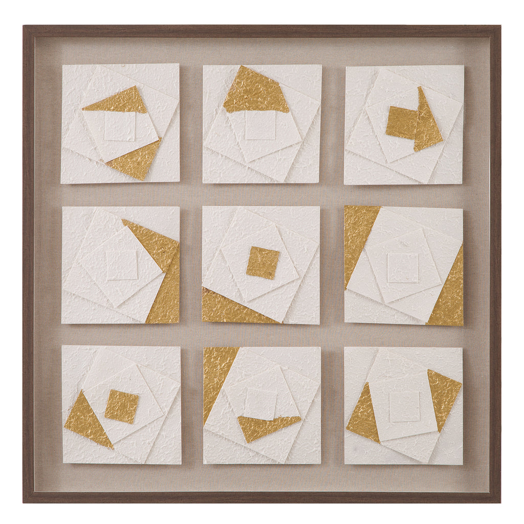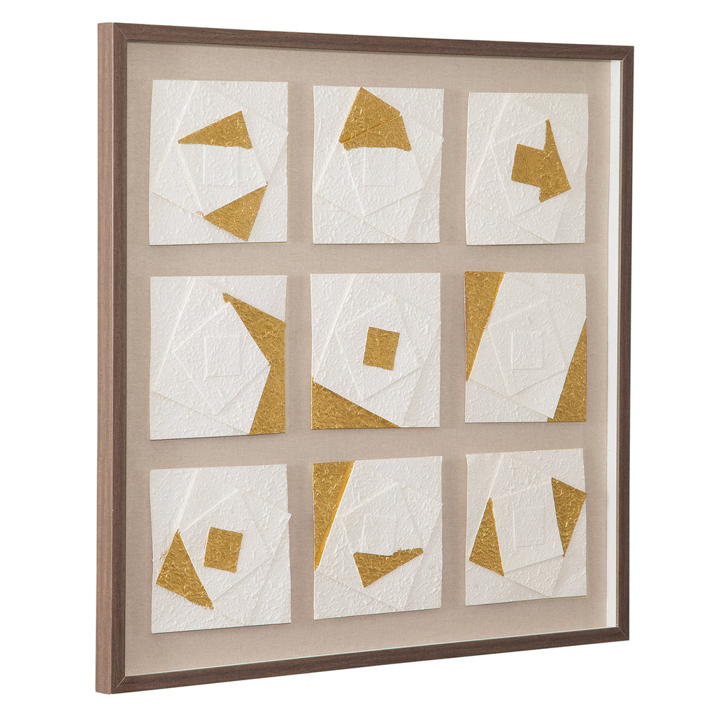 The Framework Wall Art features a modern shadowbox style design, combining a neutral linen background with nine 3D square abstract pieces. The striking white and gold accents of the pieces create a bold contrast, adding depth and visual interest to the artwork. The brown frame complements the design, providing a natural and grounding touch. This piece effortlessly blends contemporary aesthetics with artistic sophistication, making it a perfect addition to a variety of interior spaces.