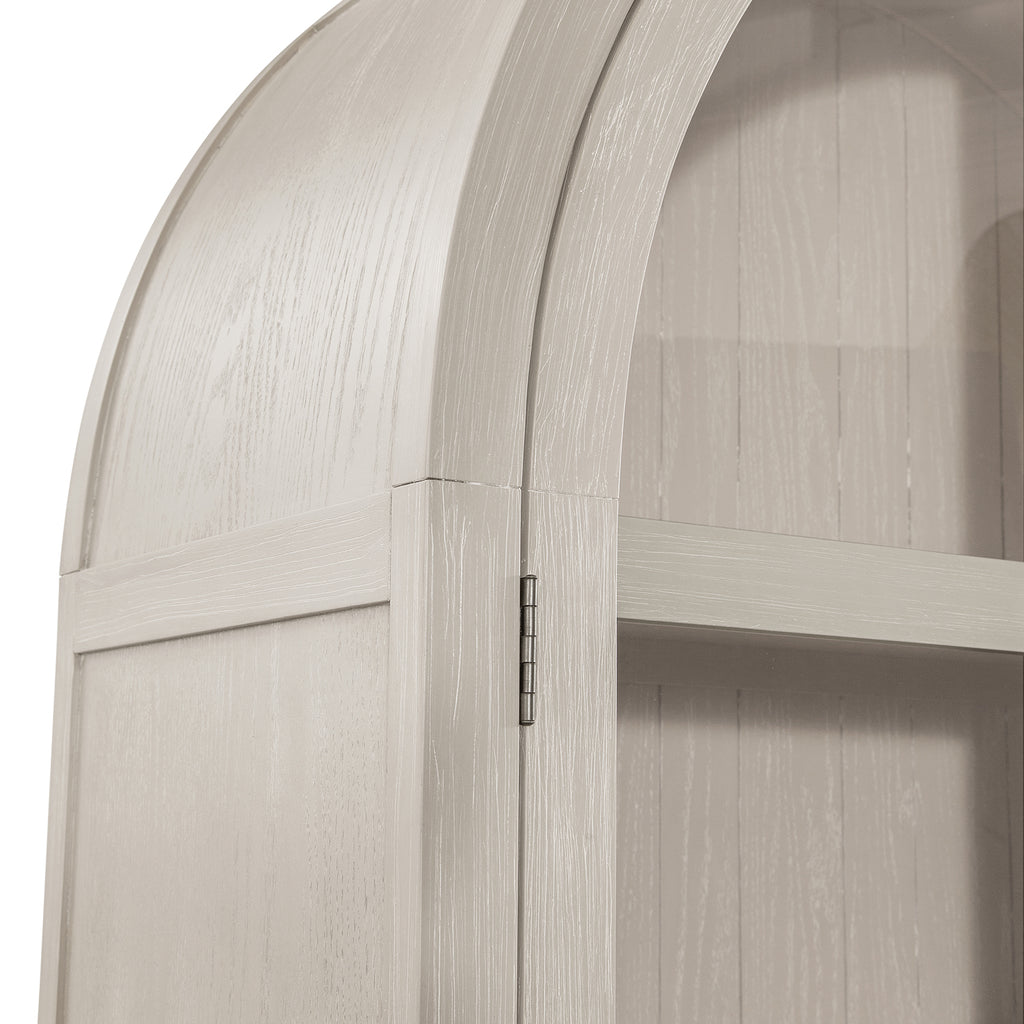 The Fynn Light Oak Display Cabinet beautifully merges modern and traditional design elements. Constructed from solid wood and flat-cut oak veneers, it features a refined cerused grey-oak finish. The cabinet showcases two arched, oversized doors that open to reveal three adjustable shelves, perfect for showcasing your favorite items. Below, a single adjustable shelf provides additional storage, elegantly accented by antique nickel-finished bar pulls. This versatile piece adds both style and functionality to any room.