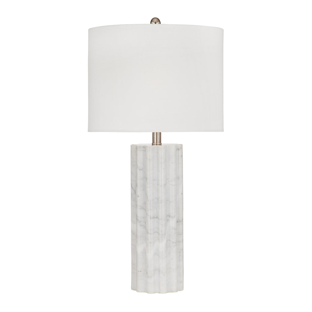 The Gabriella Table Lamp showcases timeless elegance with a contemporary edge. Its white and grey marble base features refined fluted detailing, offering sculptural appeal and natural luxury. Topped with a clean white drum shade, this piece brings understated sophistication to any setting.