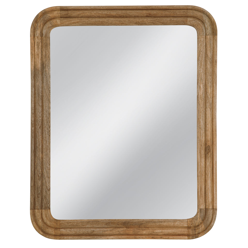 The Gage Wall Mirror presents a natural brown wood frame that exudes a rustic style. Its design features rounded corners and layered wooden outlines that add a sense of depth and warmth to the piece. The wood's natural grain and color variations enhance the mirror's organic appeal, making it a charming addition to interiors that celebrate raw, natural textures and a cozy, rustic aesthetic.