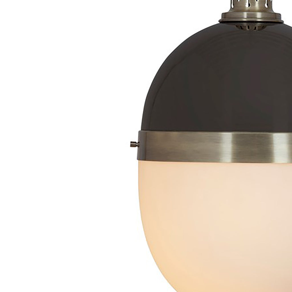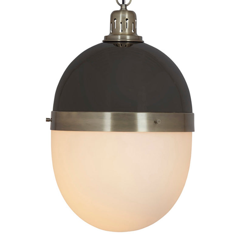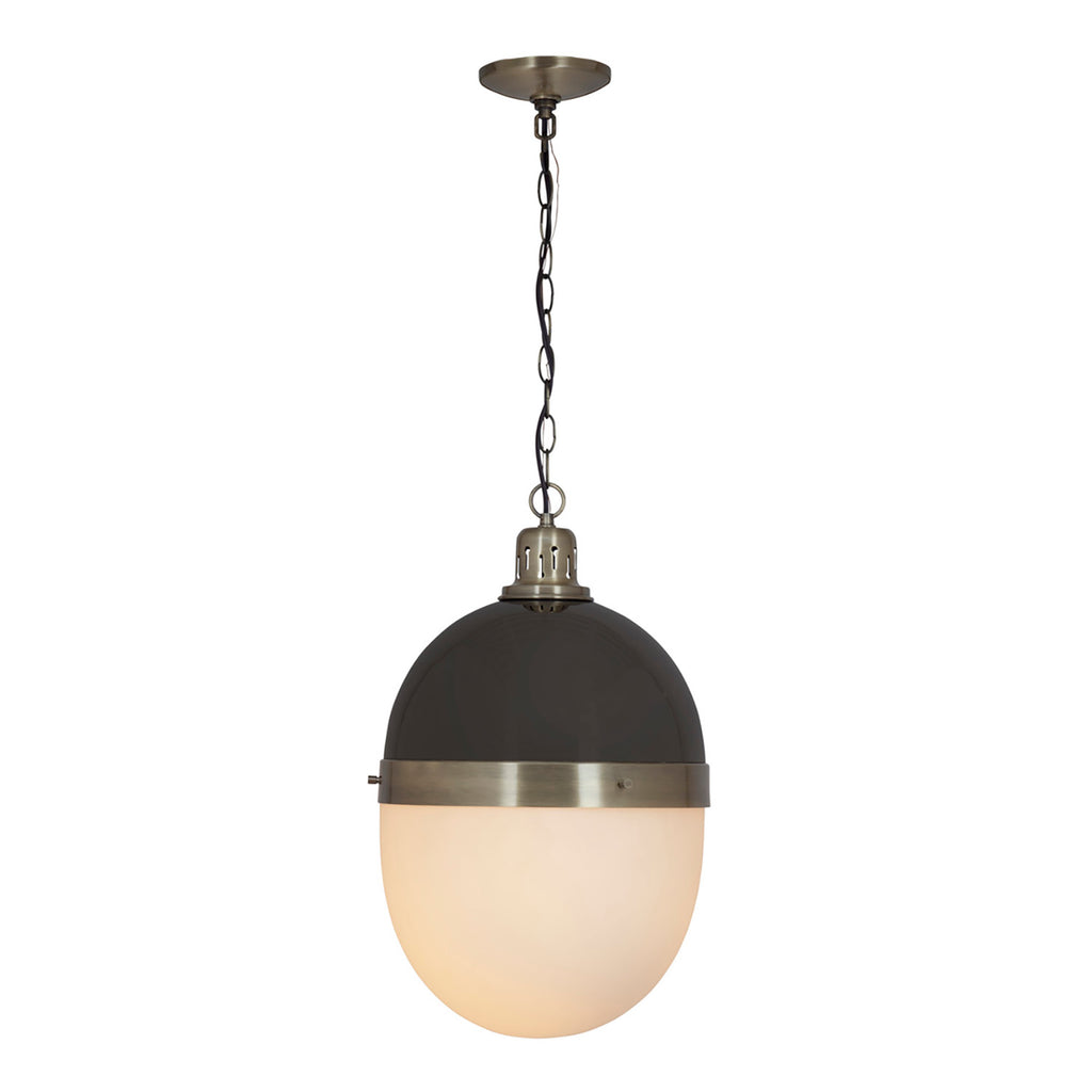 The Garfield pendant in blackened nickel with antique brass details has an acorn shape with frosted glass globe.