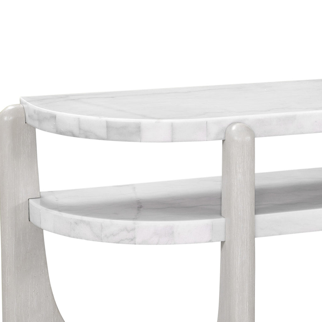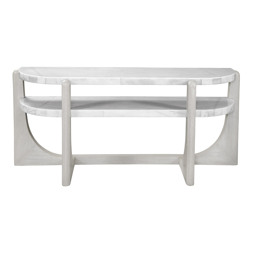 The Gavin console table seamlessly blends modern aesthetics with contemporary elegance. Featuring a white marble veneer top and shelf with a distinctive clip-corner design, it exudes sophistication. The marble top elegantly nests within a solid wood frame, meticulously wire-brushed for texture and finished in a subtle driftwood stain. As marble is a natural material, each piece boasts unique variations in color and grain, adding to its allure. With its modern, contemporary design and luxurious combination of white marble and driftwood, the Gavin console table is the epitome of timeless beauty for any space.