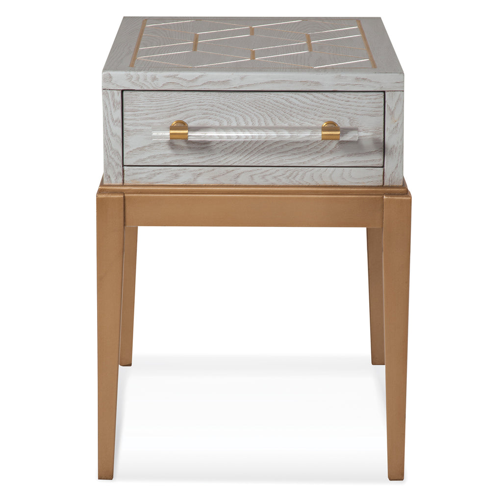 The Perrine Chairside Table will make the perfect addition for your home. The gold legs pop against the soft graphite gray table top. The top is accented with antique gold geometric inlay design, and custom acrylic hardware for the draw pulls.