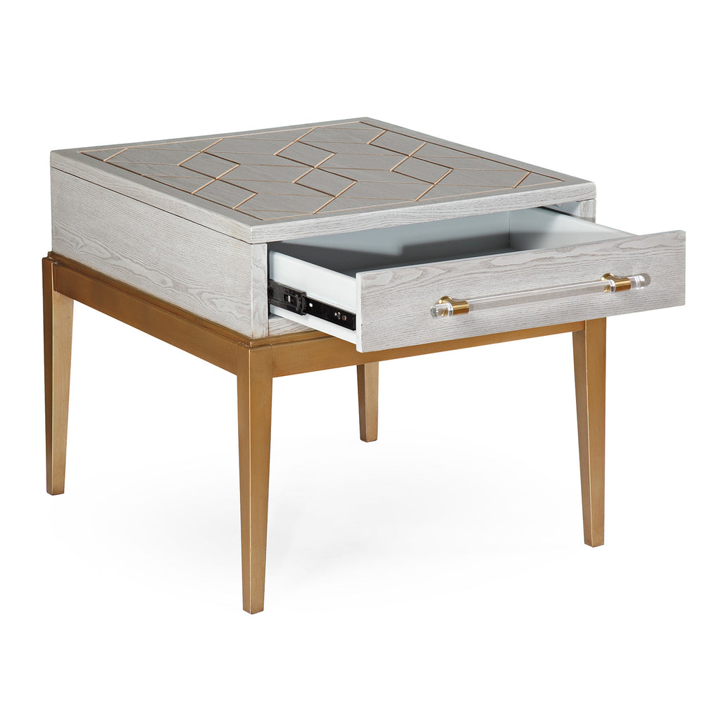 The Perrine Rectangular End Table will make the perfect addition for your home. The gold legs pop against the soft graphite gray table top. The top is accented with antique gold geometric inlay design, and custom acrylic hardware for the draw pulls.