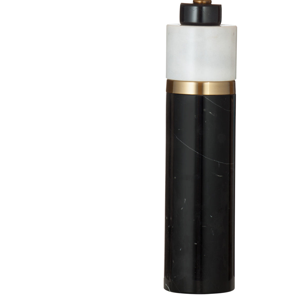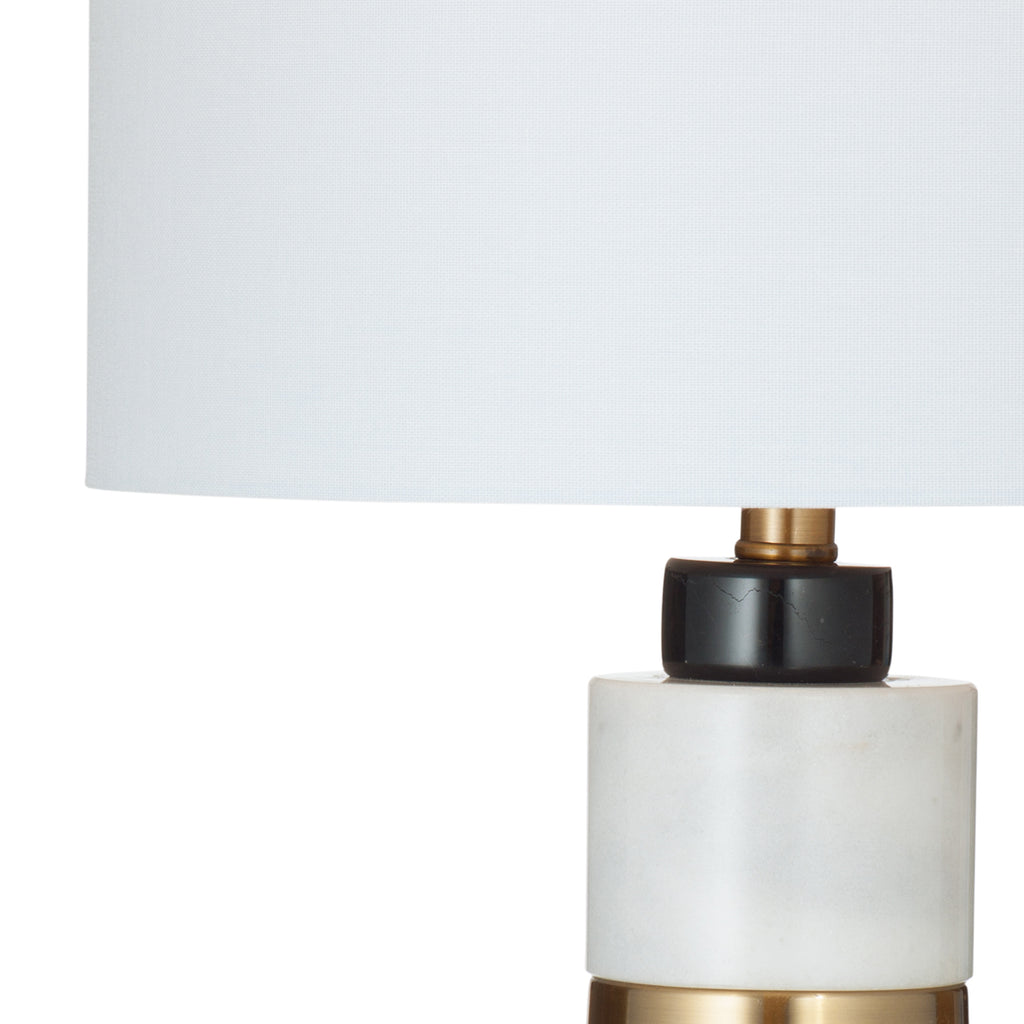 The Gregory Table Lamp features a sleek two-tone black and white marble base with gold accents, offering a sophisticated contrast that complements a variety of modern interiors. The white drum shade softens the light, creating a warm, inviting glow. Its contemporary design adds a touch of elegance to any space, making it a versatile and stylish choice for living rooms, bedrooms, or offices. The Gregory Table Lamp combines refined materials and clean lines to enhance your decor with both form and function.