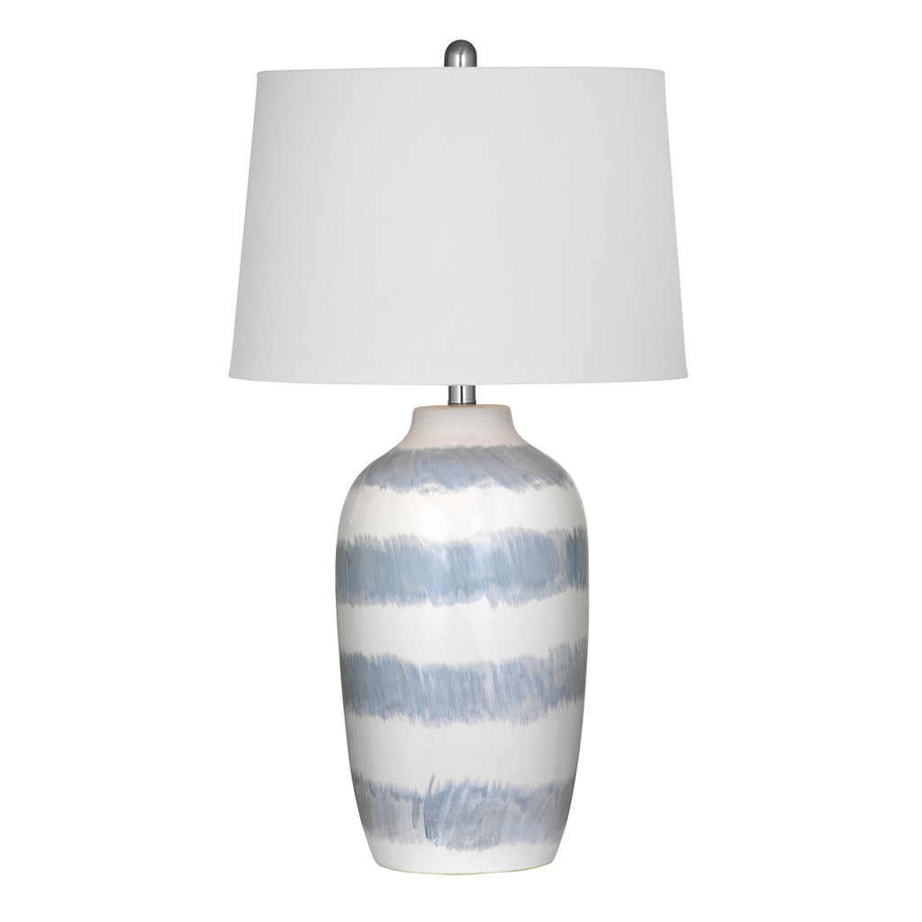 The Harper Table Lamp boasts a ceramic body with a visually soothing pattern of horizontal blue stripes, reminiscent of serene ocean waves or soft brushstrokes on canvas. This artistic element is capped with a simple white lampshade, ensuring that the lamp provides a subtle yet compelling visual interest and a calming light in any room it's placed. It's an ideal choice for spaces that aim to create a peaceful atmosphere with a hint of coastal inspiration.