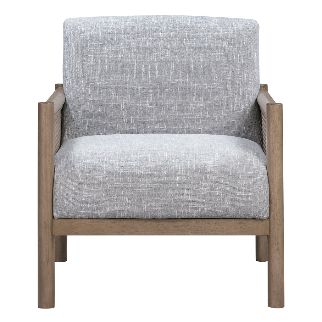 The Hedges Accent Chair is a coastal and boho inspired design. The accent chair frame is constructed of solid wood and features double-layered open cane detailing. The seat and seat back cushion feature a combination of high-density foam and fiber fill for long-lasting comfort. The fabric is a stain-resistant fabric in a calming Baltic blue color.