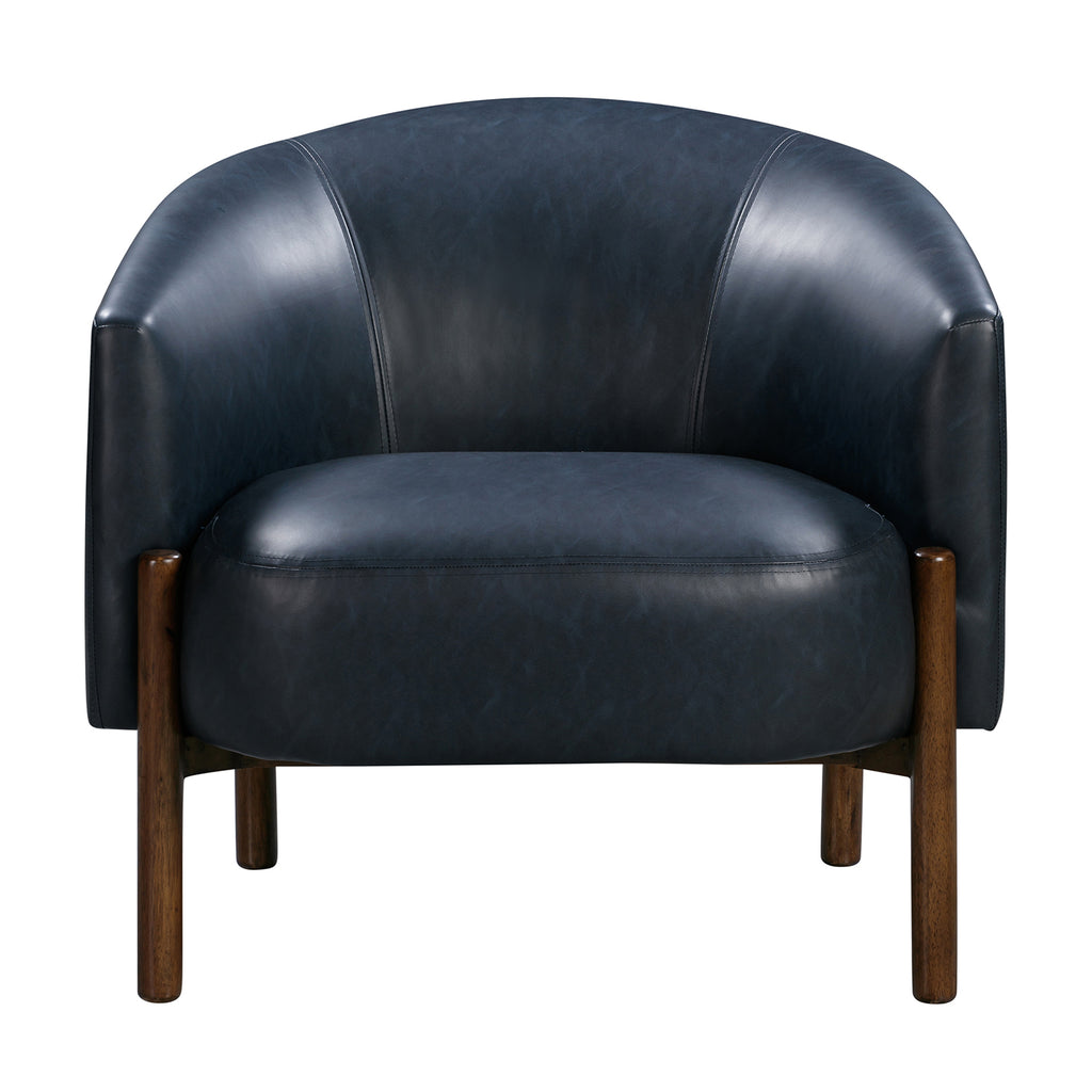The Higgins Accent Chair is a modern take on the classic barrel chair featuring a unique exposed wood base in a warm walnut finish and metal stretcher that hugs the outside of the seat back. The chair is constructed with a combination of high-density foam and fiber fill and the fabric is a stain-resistant 100% polyester performance faux-leather in a deep, rich navy-blue color.