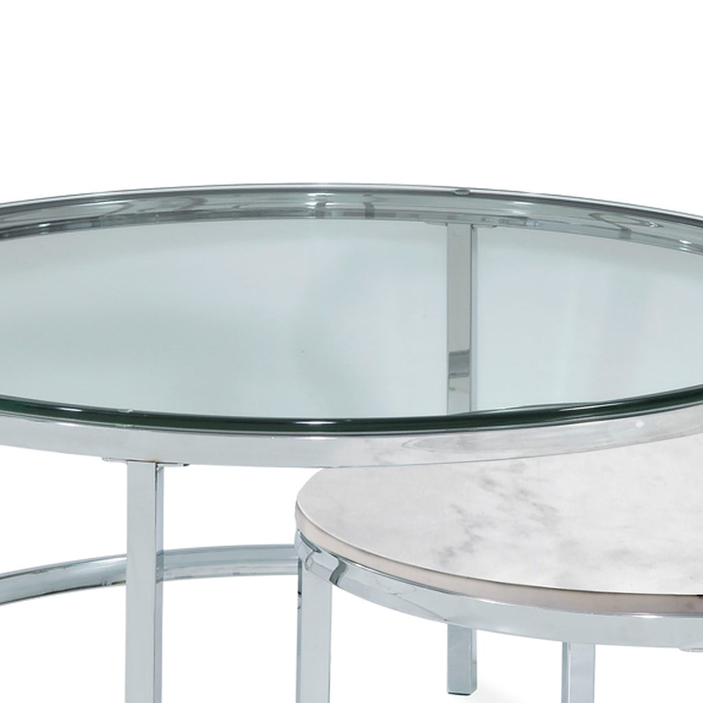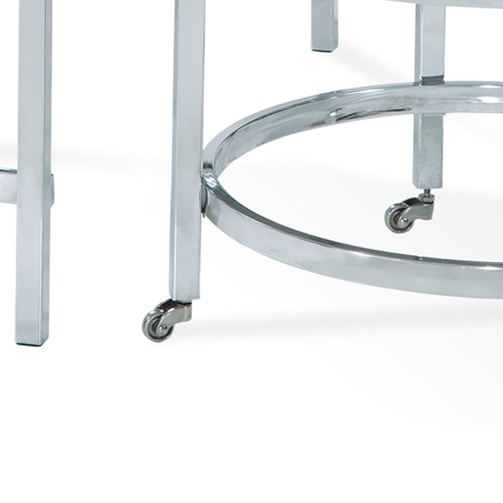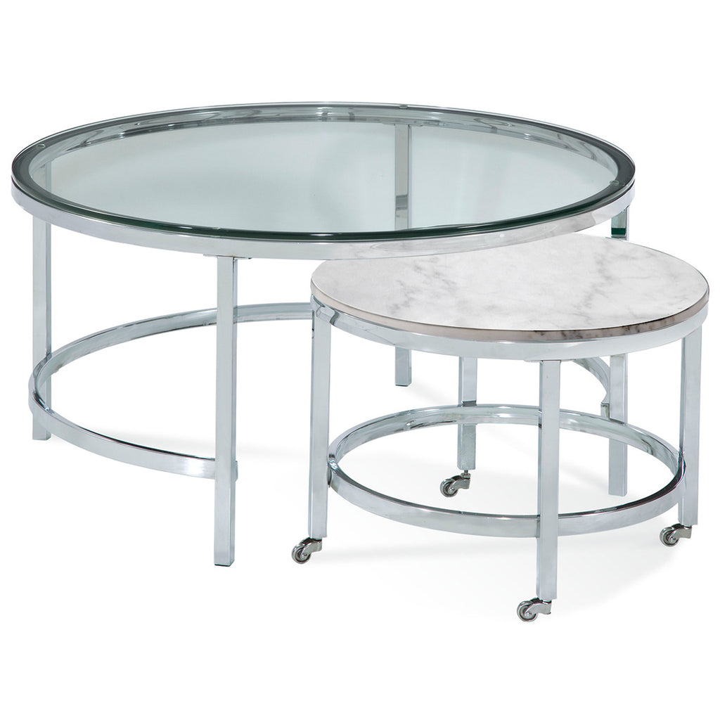 The Jadyn round cocktail features a cocktail with a clear glass top and a nesting table with a solid stone top and piano casters.