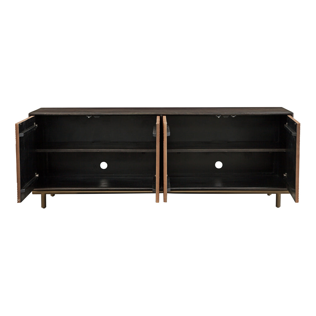 Introducing the Keir Server seamlessly blends modern aesthetics with a warm, moody color palette. Crafted from solid mango wood, its two-tone dark brown and ebonized finishes create captivating visual contrast. The dramatic iron base, finished in brushed brass, adds sophistication. Opening the doors reveals an organic-inspired geometric design, complemented by push-clasp hardware. Inside, discover functionality at its best with four adjustable shelves and thoughtful media cord management.