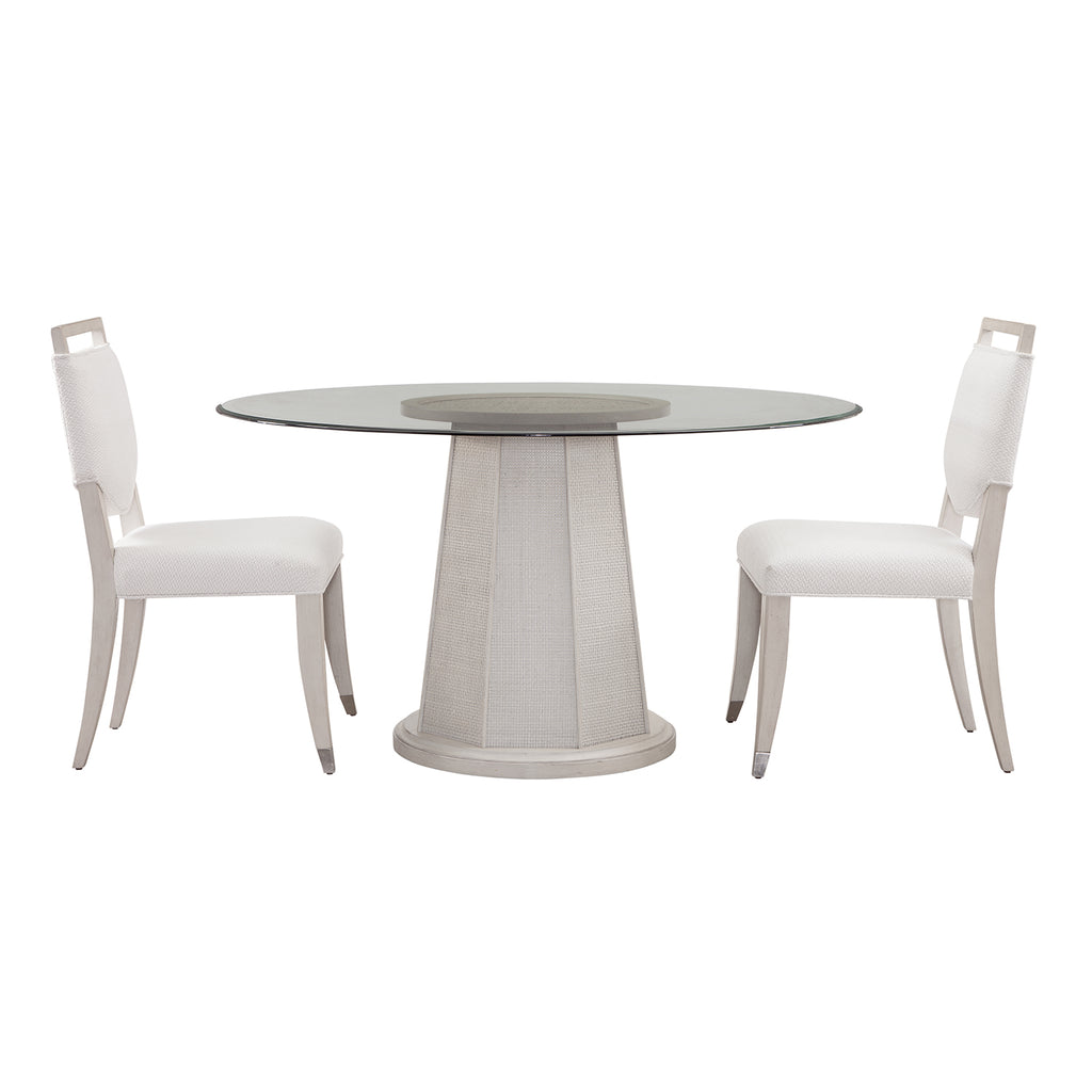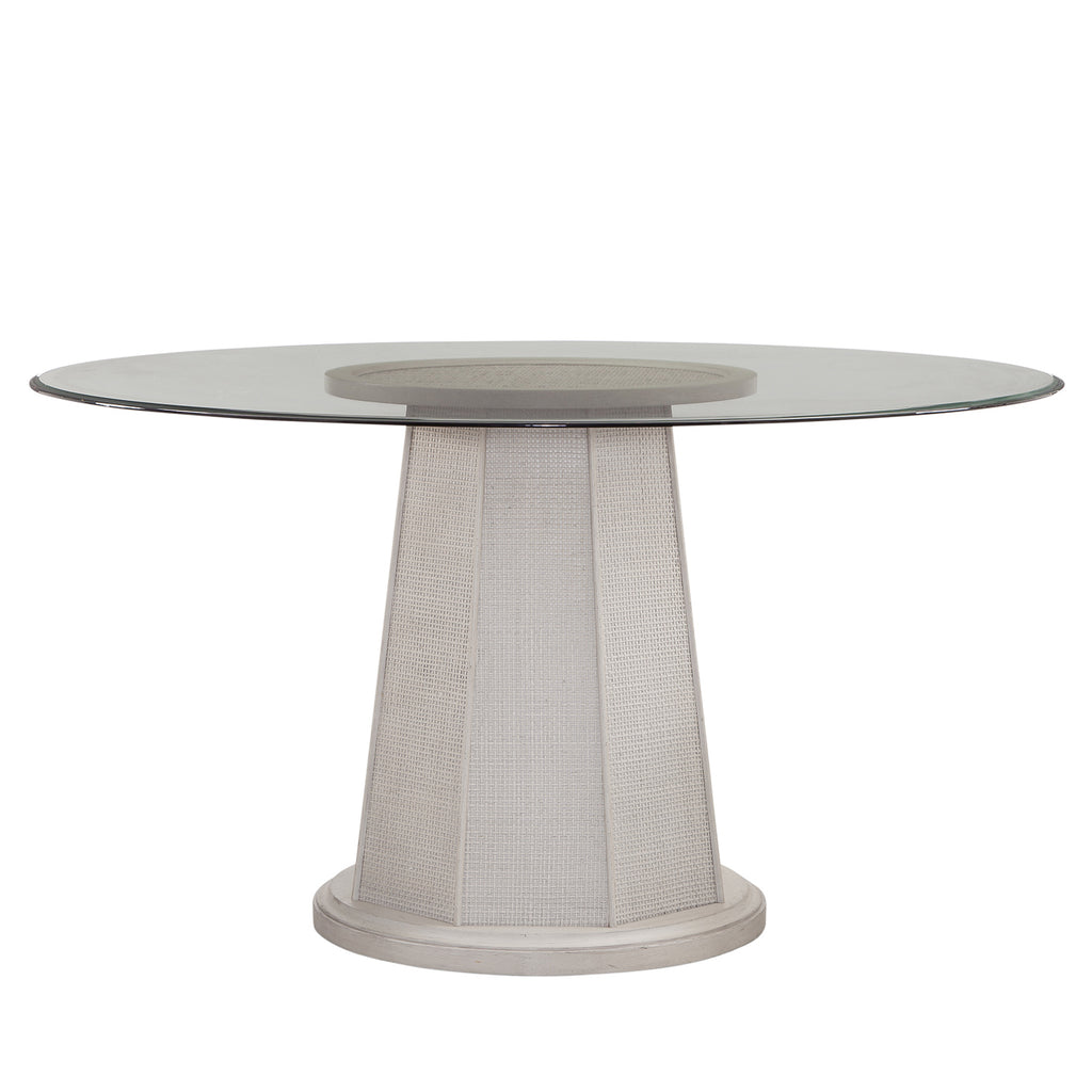 The Korey Round Dining Table seamlessly merges modern Boho and Coastal design elements. It features a tapered pedestal base and intricate box-weave cane detailing throughout, all finished in a neutral white-wash on mindi veneers. This table includes a 48" round glass top, making it a versatile addition to your dining space and providing comfortable seating for 4 adults. Crafted from high-quality rubberwood solids and select mindi veneers, it combines style and durability effortlessly.