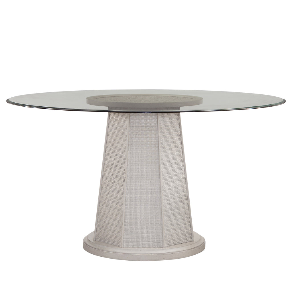 The Korey Round Dining Table seamlessly merges modern Boho and Coastal design elements. It features a tapered pedestal base and intricate box-weave cane detailing throughout, all finished in a neutral white-wash on mindi veneers. This table includes a 54" round glass top, making it a versatile addition to your dining space and providing comfortable seating for 4-6 adults. Crafted from high-quality rubberwood solids and select mindi veneers, it combines style and durability effortlessly.