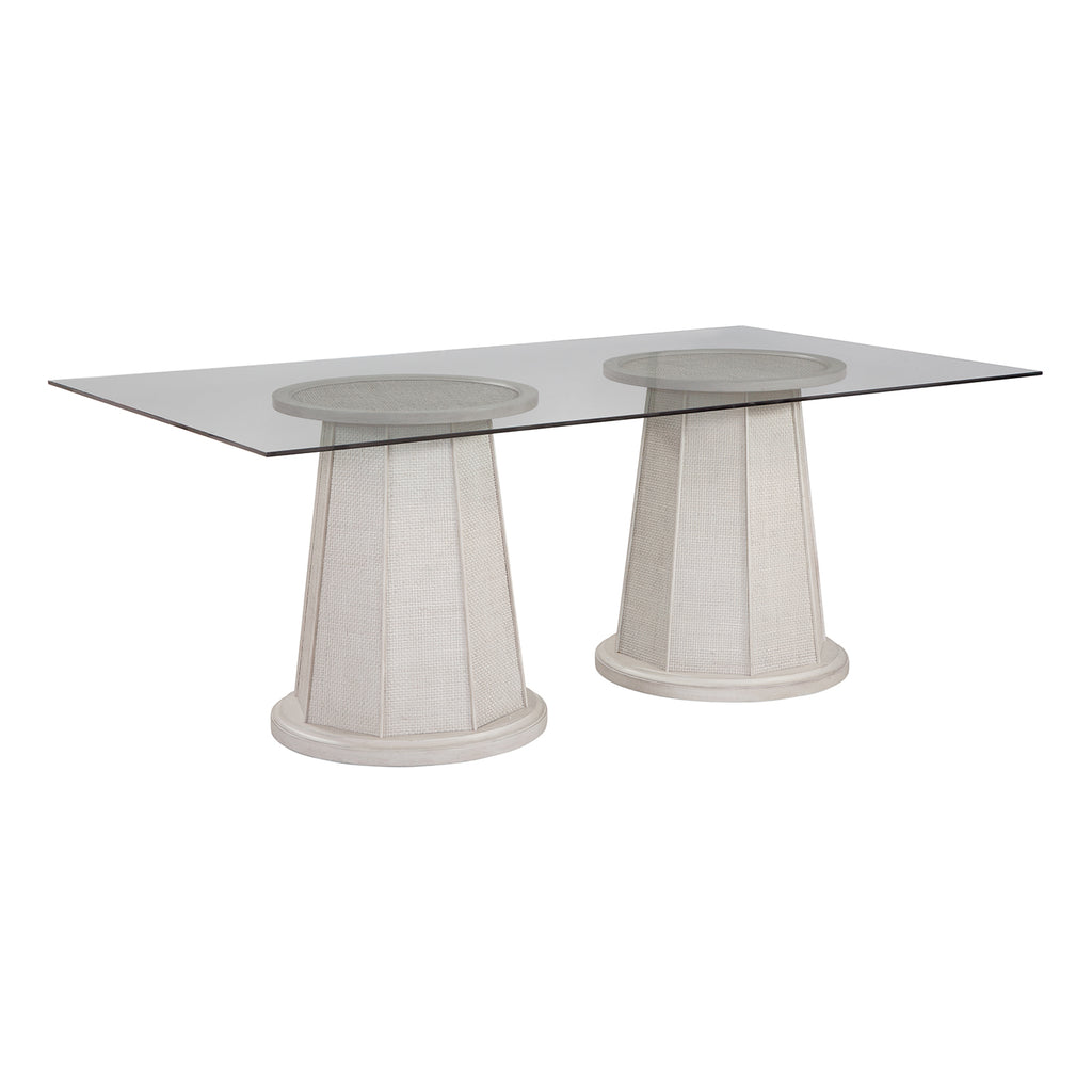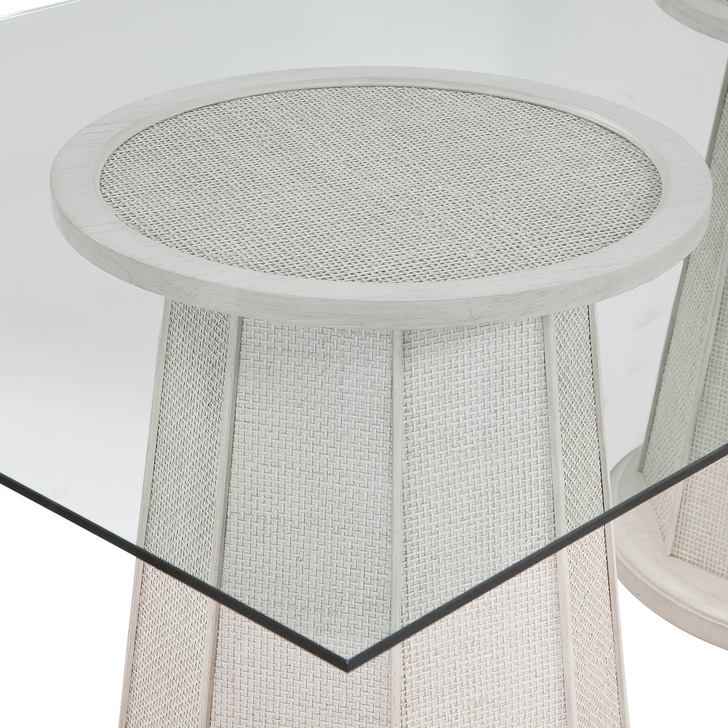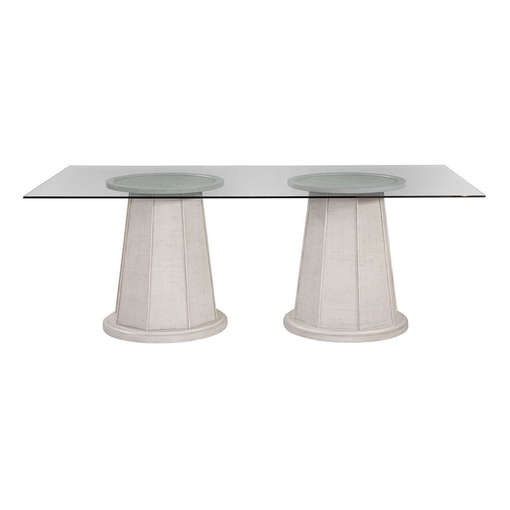 The Korey dining table is a modern mix of Boho meets Coastal design with white-washed mindi veneers. The tapered double pedestal base features box-weave cane detailing throughout. The glass table top measures 78in long and comfortably seats 6 adults.