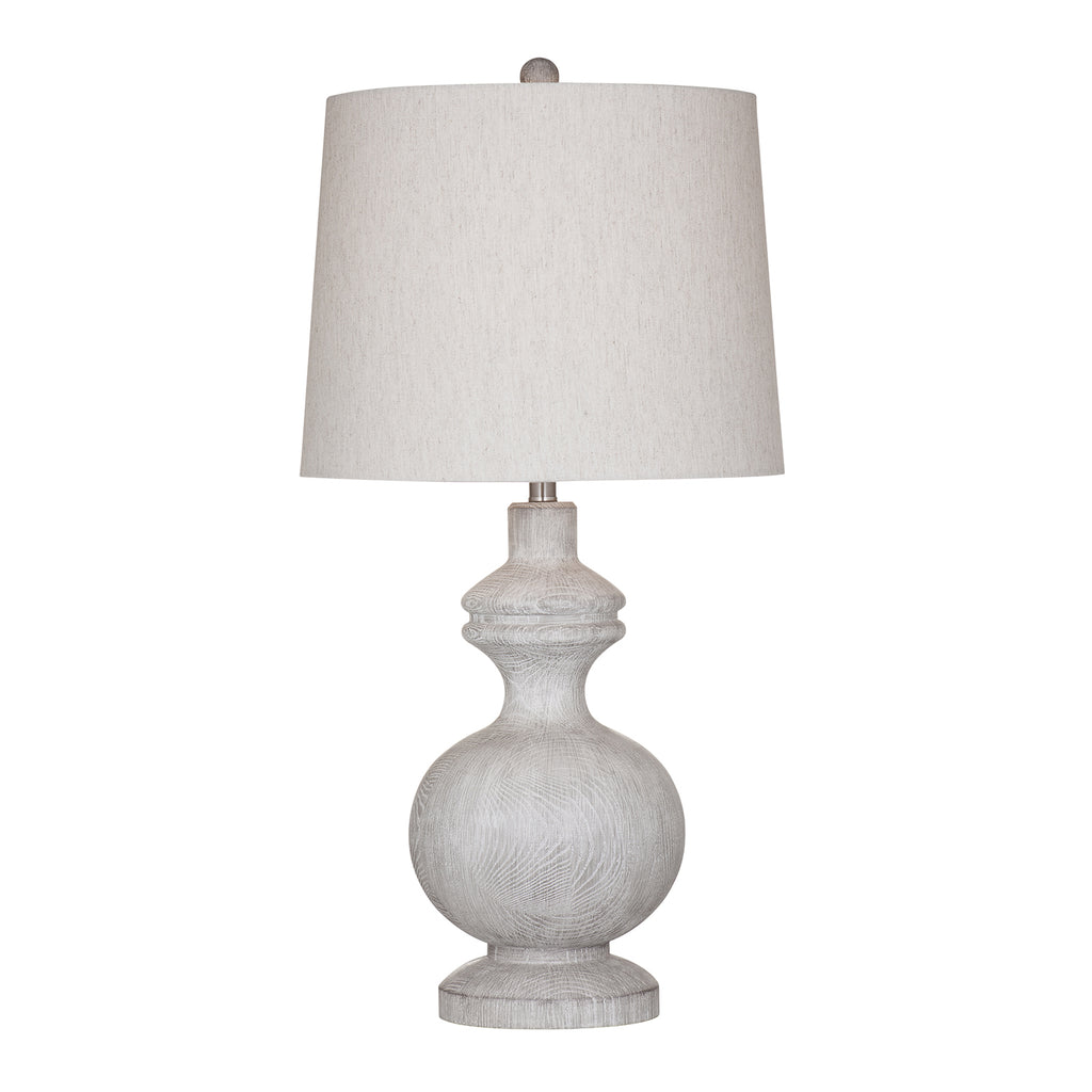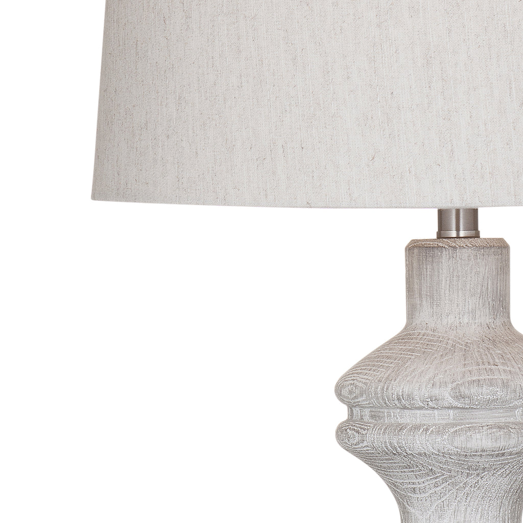 The Krishina Table Lamp combines classic charm with a rustic touch, featuring a resin body with a weathered finish. The base is shaped in a traditional baluster form, exuding the aesthetic of antique turned wood. It's topped with a textured fabric shade in a neutral tone that softly diffuses the light, creating a warm and inviting glow. This lamp's design makes it an excellent choice for interiors that covet a touch of vintage grace with the durability and stability of resin.
