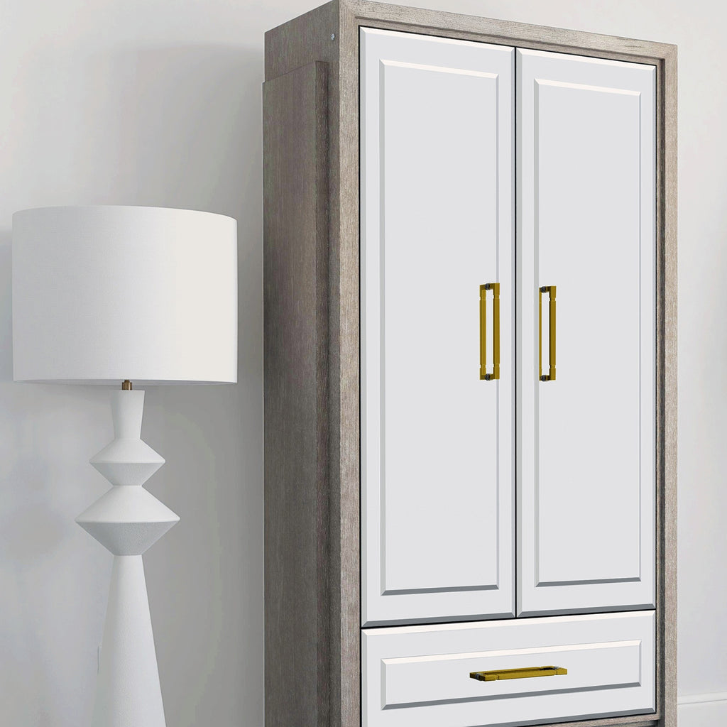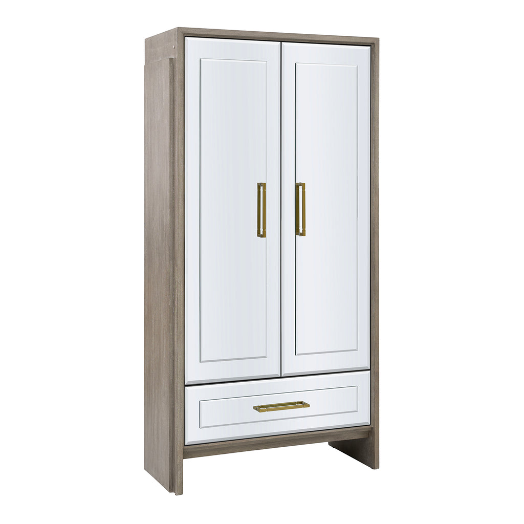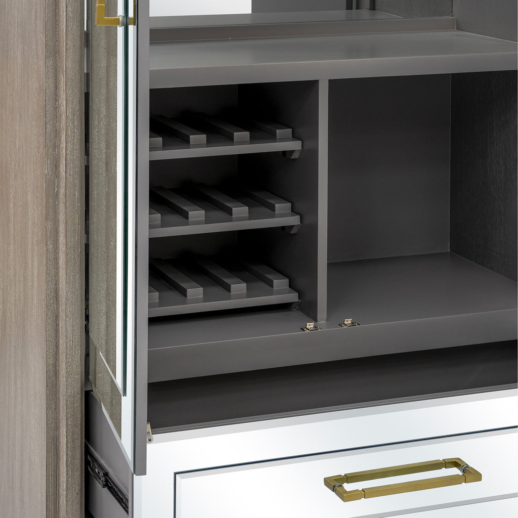The Lansing Tall Bar Cabinet exudes modern-glam elegance with its cerused grey oak case and sleek mirrored doors, highlighted by brushed gold bar-pull hardware. Inside, an illuminated mirrored back panel adds sophistication, while dedicated storage for stemware and bottles ensures functionality. An additional drawer provides extra convenience, making this bar cabinet a stylish and practical addition to any entertaining space.