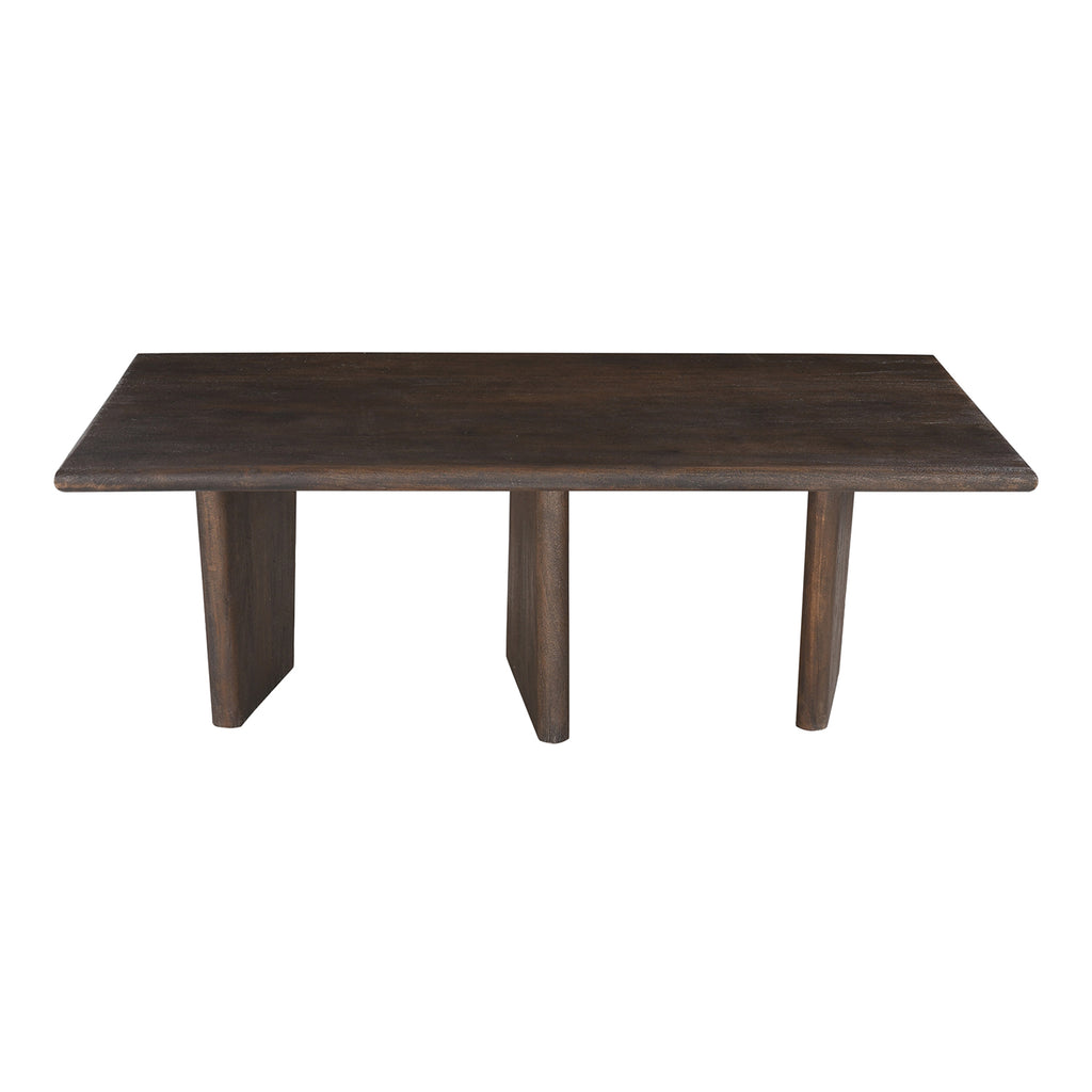The Lasso Rectangular Cocktail Table features a modern organic inspired design. The thick, soft-edged table top sits on a unique, offset tapered base design. This cocktail table is constructed with solid mango wood that's been sandblasted for texture with a deep, antiqued brown stain that highlights the features of the natural wood. Look for other items in the Lasso Collection to complete the set.