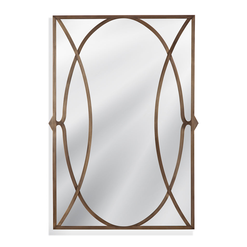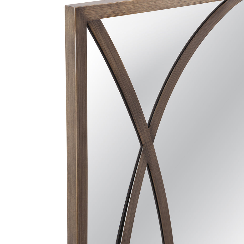 The Lattice Wall Mirror boasts a rectangular shape with an interlocking circle pattern, framed in bronze-finished metal, seamlessly blending modern and traditional aesthetics.Crafted with attention to detail, this mirror effortlessly merges modern and traditional styles, adding a timeless elegance to any room. Elevate your decor effortlessly with the stylish and versatile Lattice Wall Mirror.