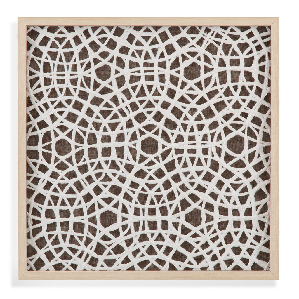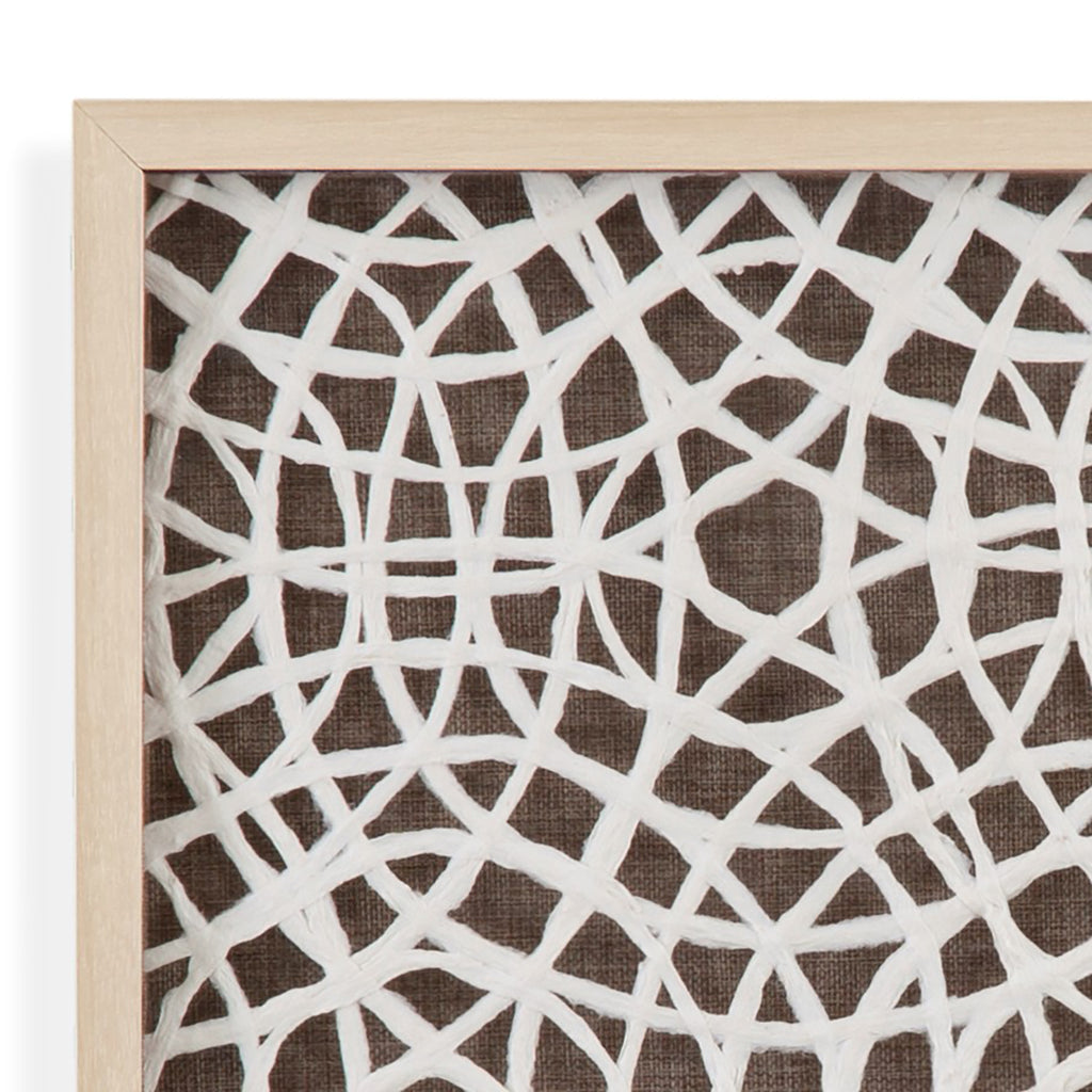 Lined Wall Art is a shadow box accentuated with a rice paper-like brown mat and a circular radiating pattern of woven white rattan with a natural blonde molding.