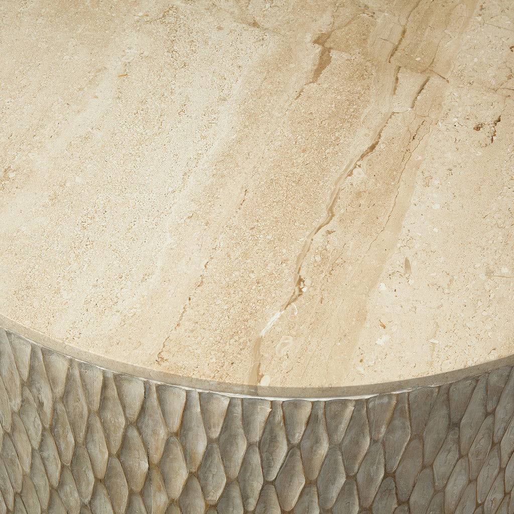 The Lorenzo Coffee Table is where modern design meets boho charm in a beautiful blend of style and functionality. Crafted with a carved solid mango wood base in a soothing white wash finish, this round coffee table exudes natural elegance. The natural travertine top adds a touch of luxury, creating a perfect balance between rustic warmth and modern sophistication. Thoughtful design details like the convenient casters make it easy to move, allowing you to transform your space effortlessly. The Lorenzo Coffee Table is more than just a centerpiece for your living room. It's a conversation starter, a statement piece, and a reliable companion for your everyday moments. Embrace the harmony of design and practicality with this stunning addition to any space.