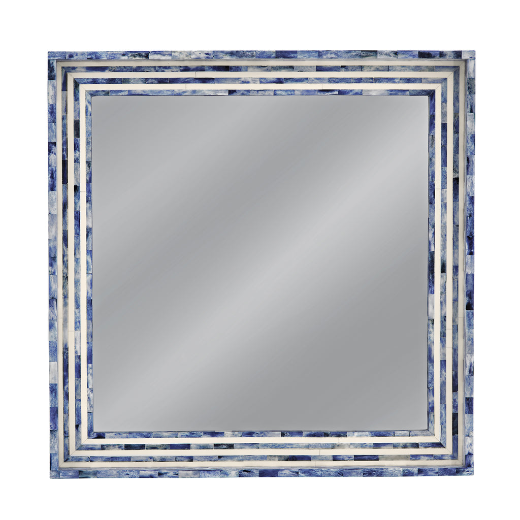 The Mabrey Wall Mirror exudes a boho-coastal vibe with its charming square design and striking blue and cream bone frame. This unique piece adds a touch of artisanal flair to your space, creating a relaxed and inviting atmosphere. Crafted with care and attention to detail, it serves as both a functional mirror and a stylish statement piece for any room in your home.