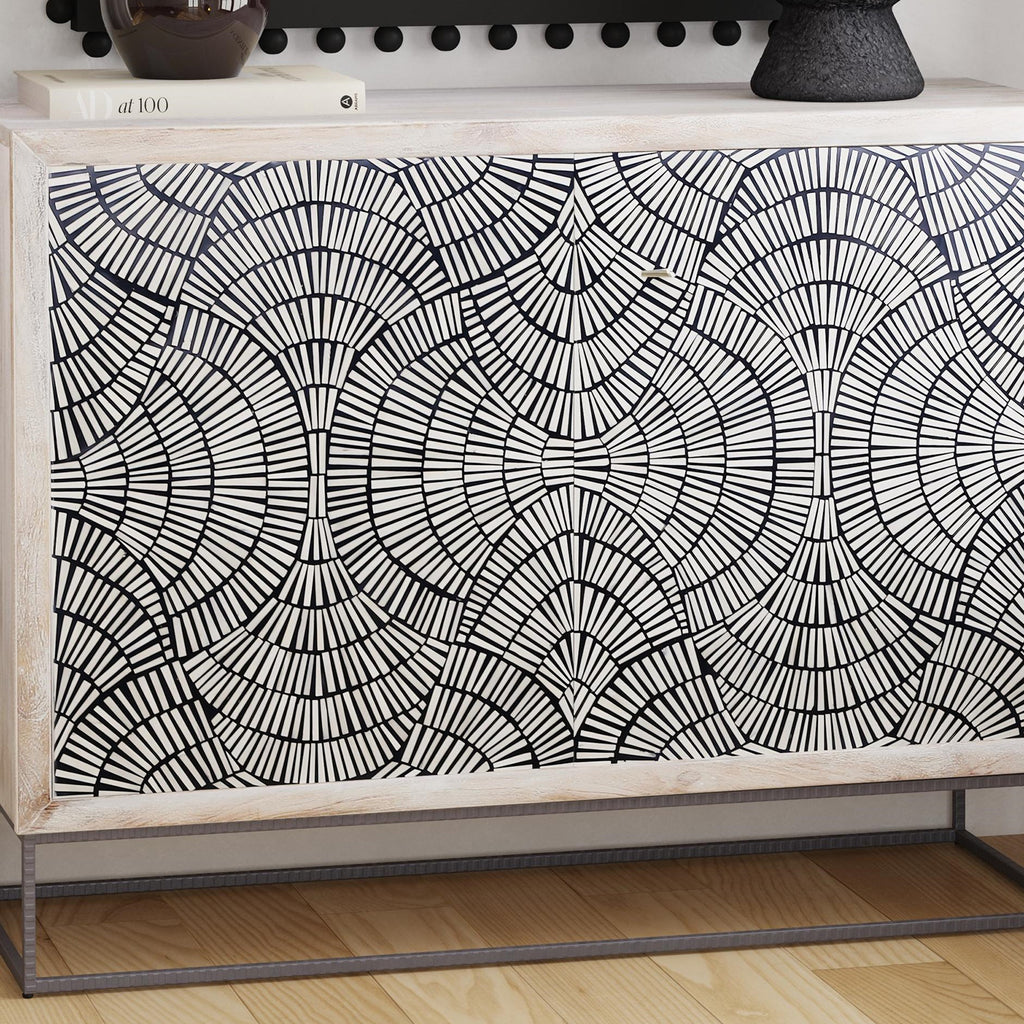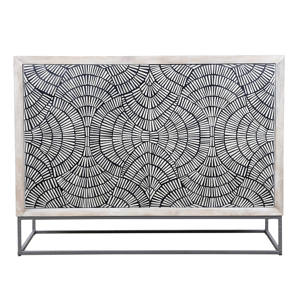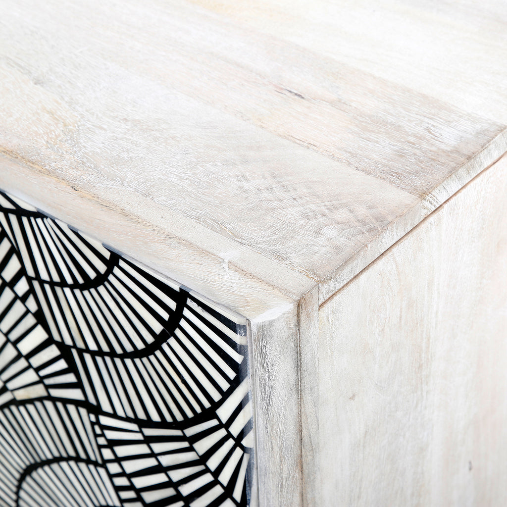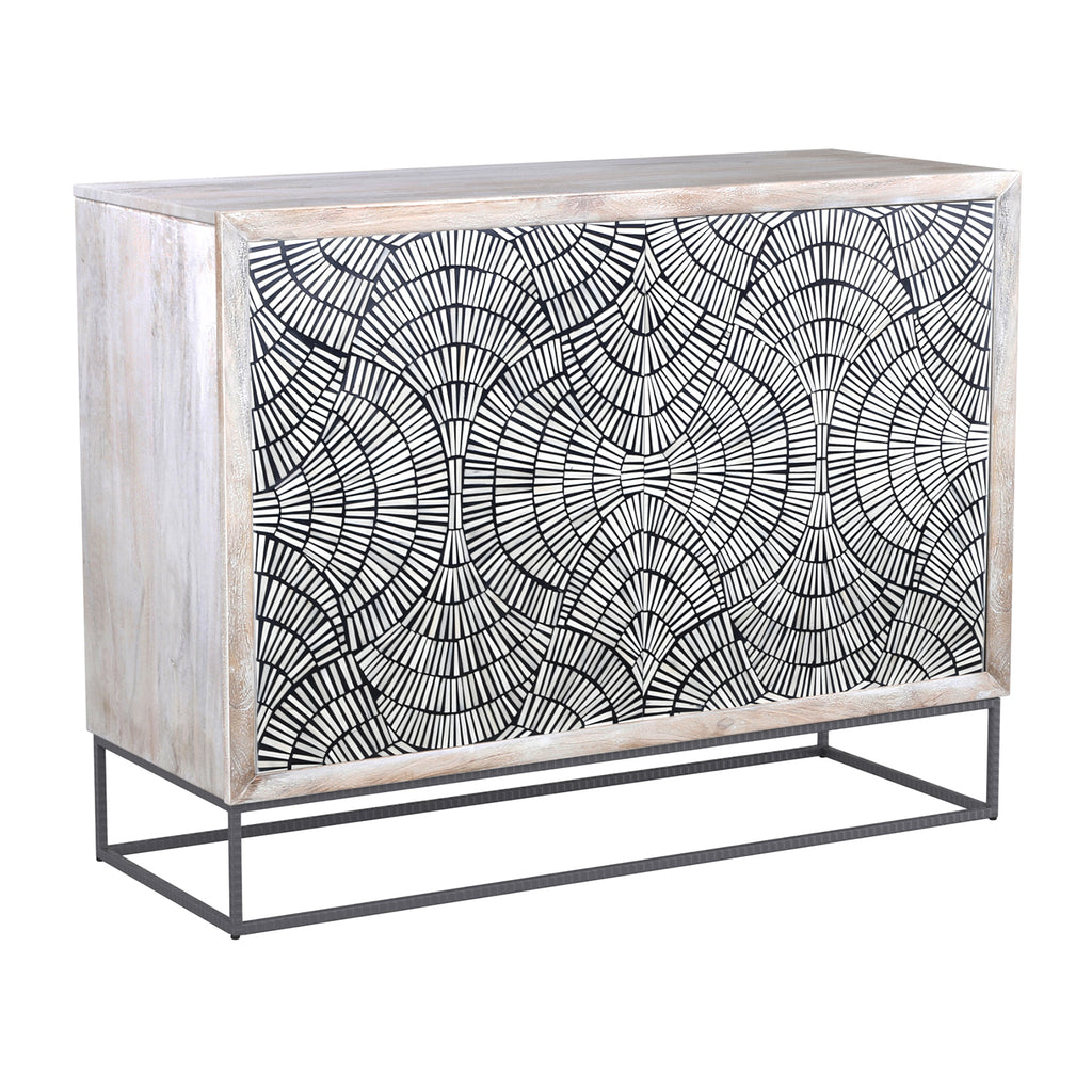 The Magnolia bar cabinet embodies a fusion of modern and bohemian styles, making it a standout piece in any space. Crafted from solid mango wood with a white-wash finish, its frame exudes a rustic yet refined charm. The touch-release doors reveal an intricately-patterned design crafted from contrasting bone and resin, adding an artistic flair. Supported by a textured solid iron base, the cabinet's interior features a crisp white finish and offers a variety of storage options for your bar essentials. As mango and bone are natural materials, each piece boasts unique variations in color, texture, and finishing, ensuring that your cabinet is one-of-a-kind. Elevate your home bar with this stylish and functional statement piece, perfect for those who appreciate modern design and natural materials.
