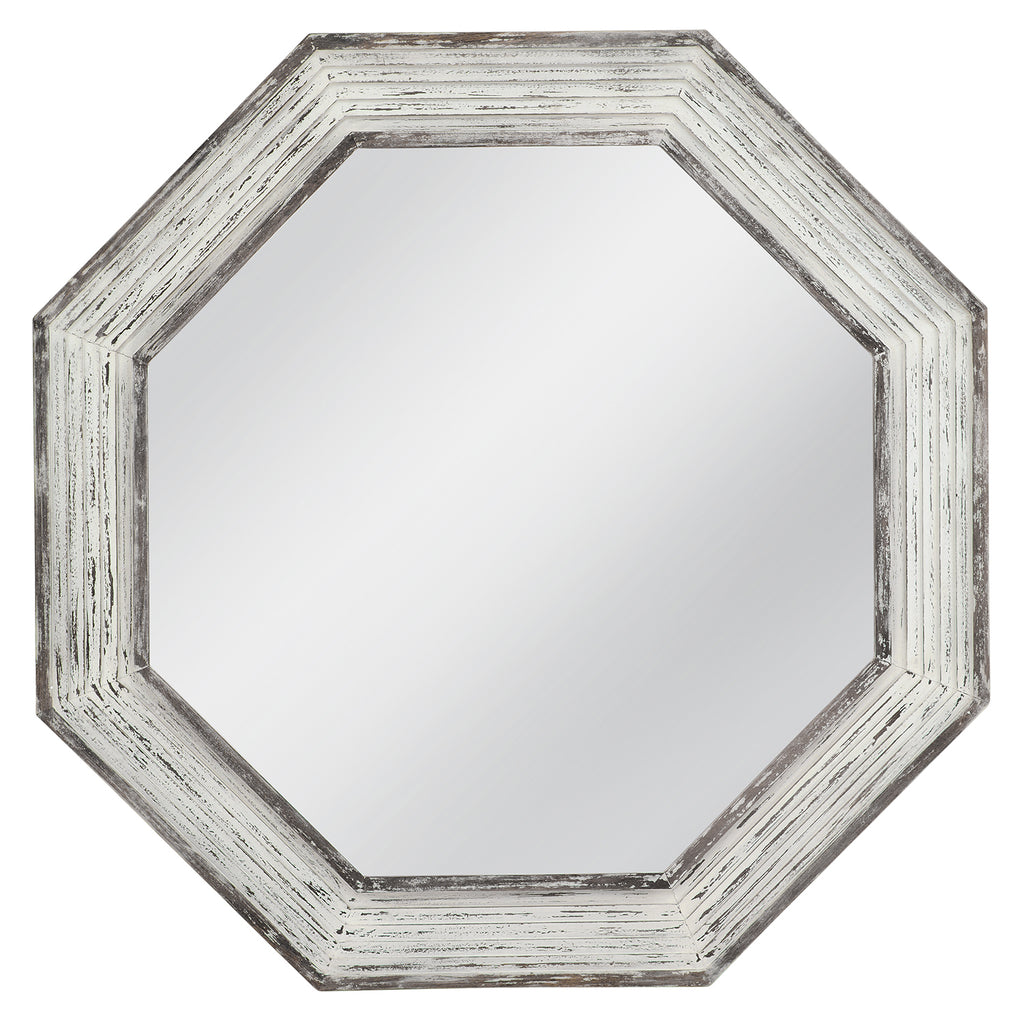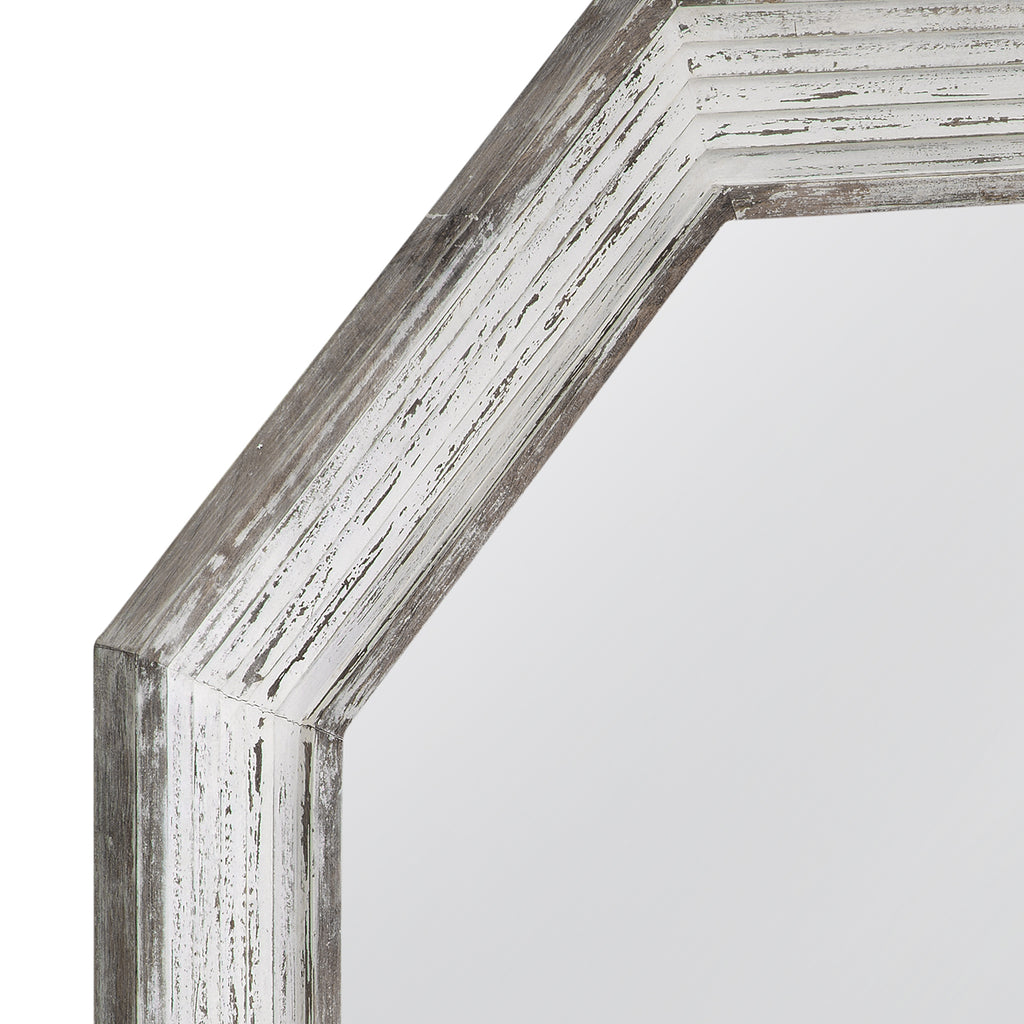 The Marden Wall Mirror features a white-washed wood frame that enhances its coastal style. The octagonal shape adds a modern geometric twist, while the distressed white finish suggests a weathered look often associated with beachside retreats. This mirror would seamlessly blend with decor inspired by the tranquility and relaxed vibe of coastal living, making it a perfect accent piece for creating a serene and inviting space.