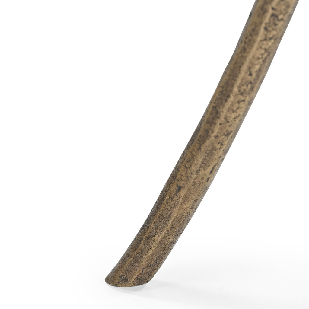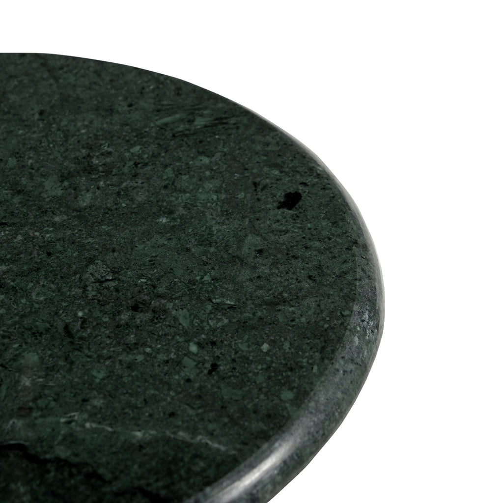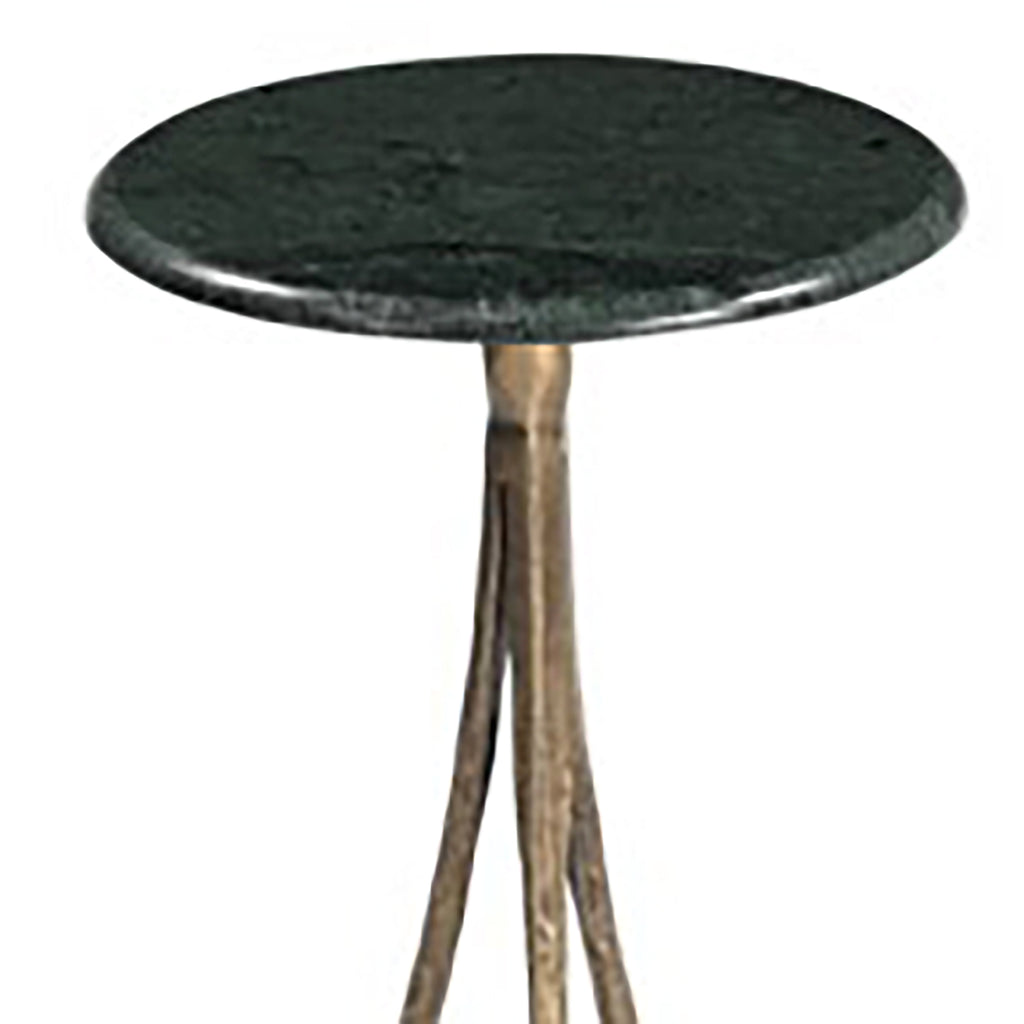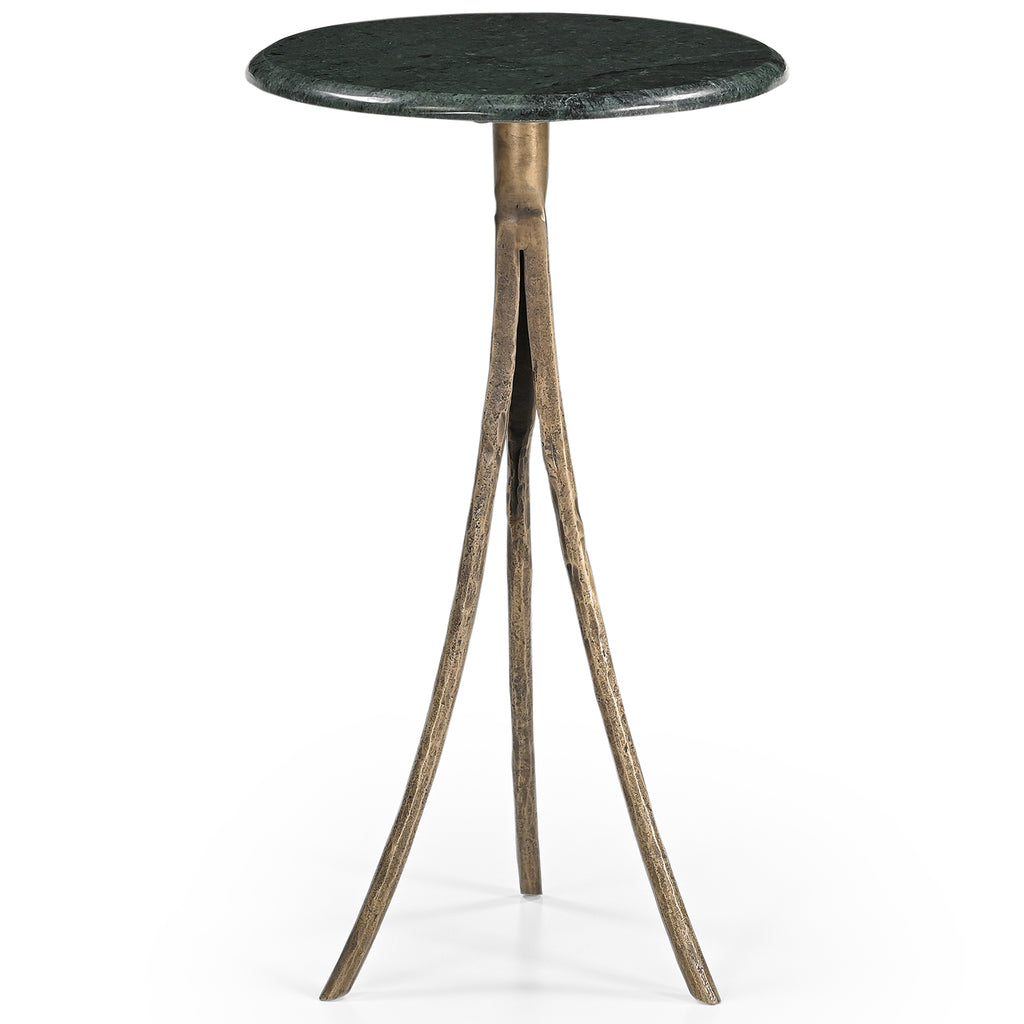 The Milo Accent Table embodies modern sophistication with its stunning emerald green marble top and antique brass-finished iron base. Its three-legged design, featuring hammered texture details, adds a touch of uniqueness to any room. Crafted from natural marble and hammered metal, each piece boasts its own distinctive characteristics, making it a truly one-of-a-kind addition to your space.