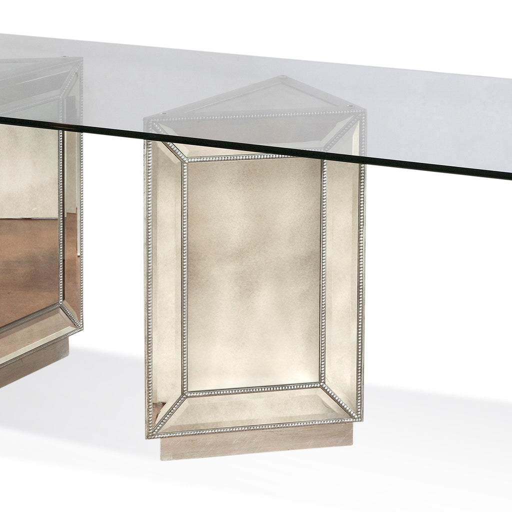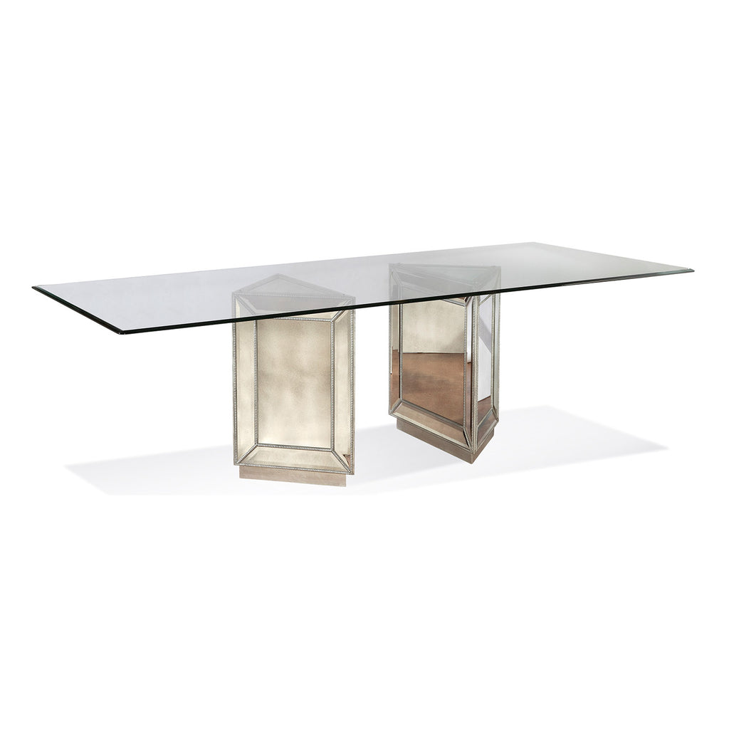 The Murano Dining Table brings elegant glam to your dining room. Featuring antiqued Picture-Frame edged mirror panels and a Silver Leaf beaded detail, the Murano is all about modern elegance meets old world charm.